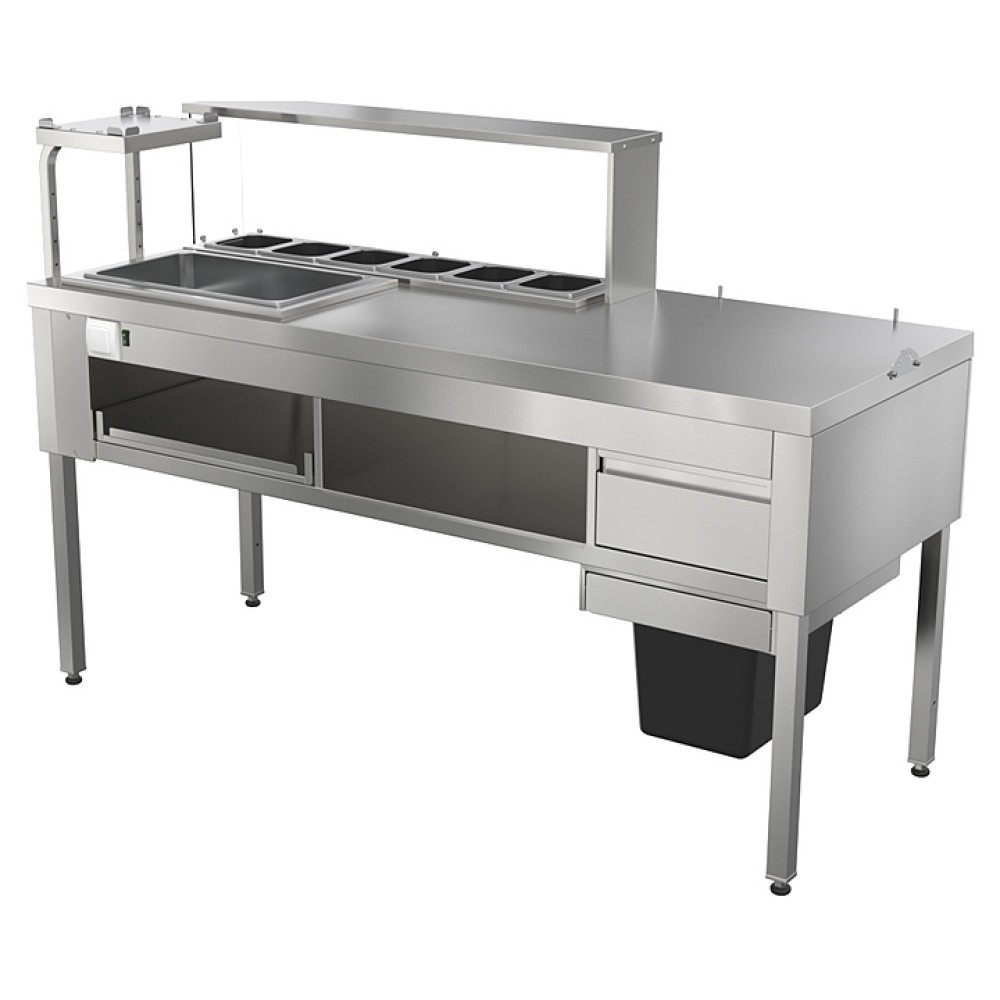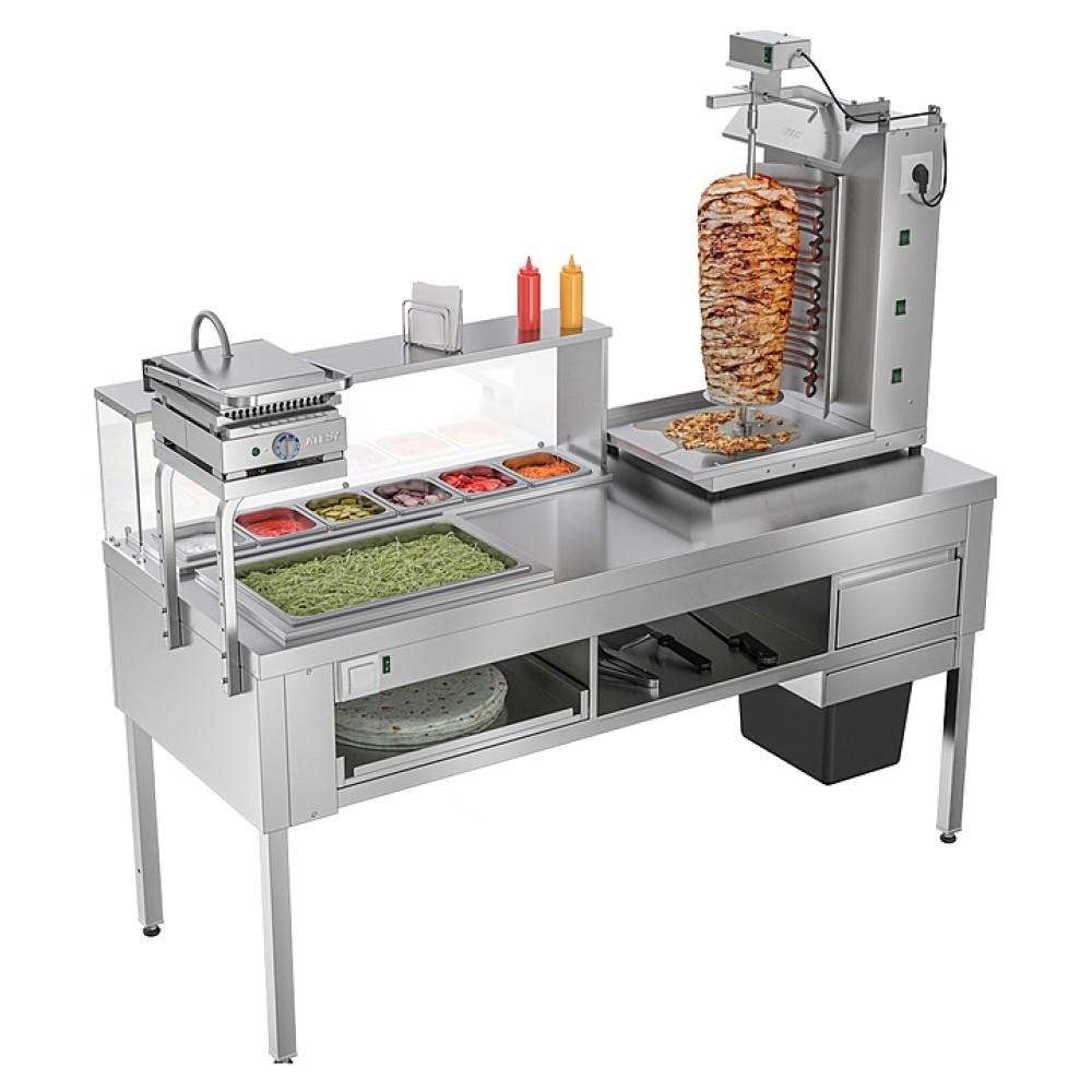 Шаурма-станция ATESY Восточный базар ШС-1800.700-02 предназначена для комплексного оснащения рабочего места приготовления и продажи шаурмы, а также для хранения предварительно охлажденных мясных полуфабрикатов, хлебобулочных изделий, начинок и соусов на предприятиях общественного питания и торговли. Станция представляет собой стол выполненный на сборно-сварном каркасе, на рабочей столешнице которого смонтированы холдеры для установки гастроемкостей с ингредиентами для шаурмы. Все конструктивные элементы станции, контактирующие с продуктами питания, выполнены из пищевой нержавеющей стали. Со стороны покупателя емкости защищены закаленным стеклом.