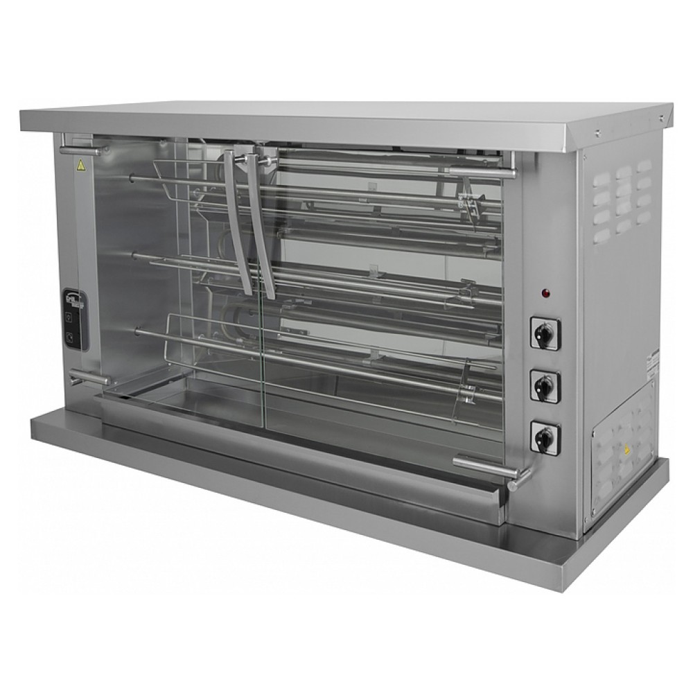 Электрический гриль Grill Master Ф3Ш1Э предназначен для приготовления кур-гриль в заведениях быстрого питания, супермаркетах и уличной торговли. Модель оснащена 2 распашными дверьми и подсветкой камеры. Благодаря непрерывному вращению тушек кур непосредственно возле нагревателей, обеспечивается их равномерное запекание. Изделие выполнено из пищевой нержавеющей стали, дверцы - из термостойкого стекла.