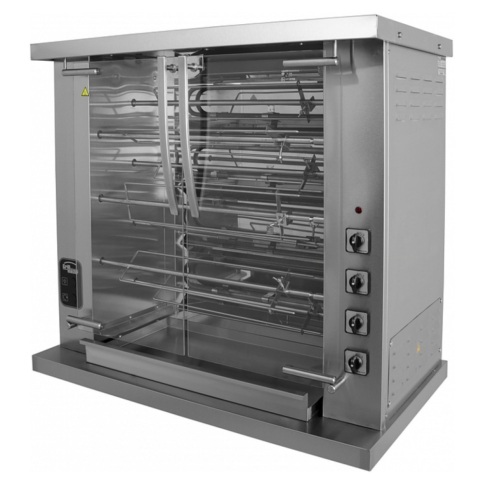 Электрический гриль Grill Master Ф4У2Э предназначен для приготовления кур-гриль в заведениях быстрого питания, супермаркетах и уличной торговли. Модель оснащена 2 распашными дверьми и подсветкой камеры. Благодаря непрерывному вращению тушек кур непосредственно возле нагревателей, обеспечивается их равномерное запекание. Изделие выполнено из пищевой нержавеющей стали, дверцы - из термостойкого стекла.