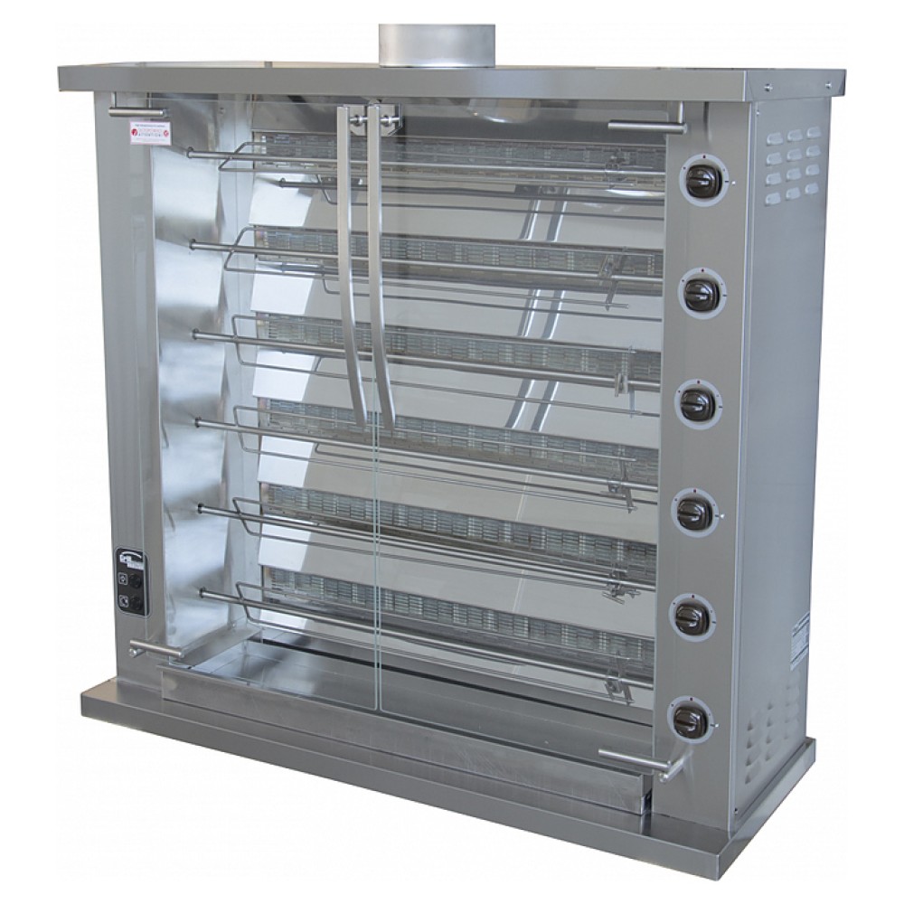 Гриль для кур Grill Master Ф6Ш1Г используется на предприятиях общественного питания и торговли для приготовления тушек кур, куриных окорочков, грудок и других продуктов. Модель оснащена системой газ-контроля, 6 съемными автономными инфракрасными горелками, 6 газовыми кранами и внутренней подсветкой. Корпус выполнен из нержавеющей стали, двери - из закаленного стекла.