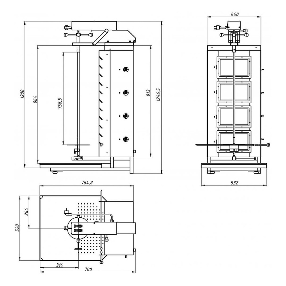Газовый гриль Grill Master Ф4ШмГ предназначен для запекания специально подготовленного свиного, говяжьего, бараньего и куриного мяса, используемого для приготовления шаурмы, на предприятиях общественного питания и торговли. Модель оснащена усиленным мотором для большей производительности и 4 горелками с системой газ-контроль для защиты от утечек газа и мотором. Изделие выполнено из пищевой нержавеющей стали.