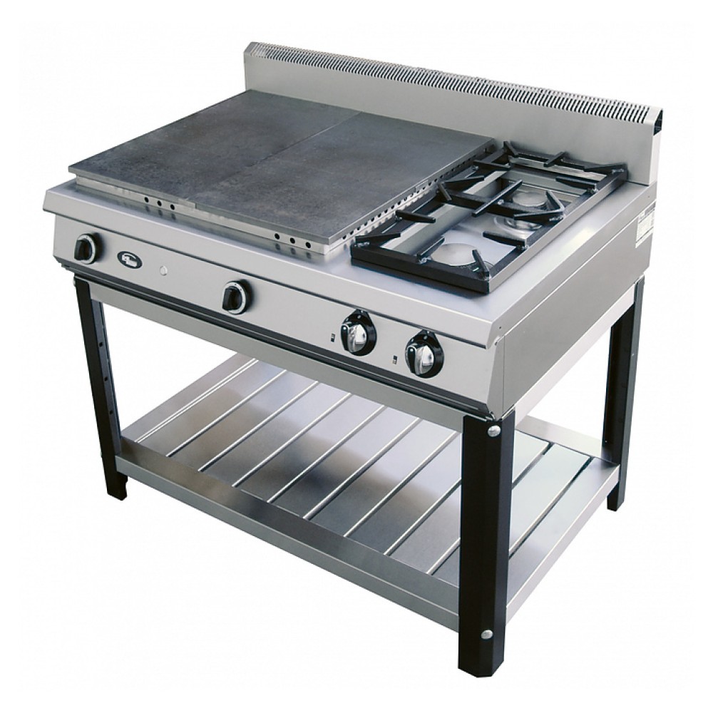 Газовая плита Grill Master Ф6ЖТЛСПГ(П) (2+2) предназначена для приготовления широкого ассортимента блюд в наплитной посуде в кафе, ресторанах и на других предприятиях общественного питания и торговли. Модель оснащена сплошной поверхностью с 2 закрытыми конфорками, 2 горелками открытого типа класса Have Duty, электророзжигом, газ-контролем, подключением к магистральному газу, открытым разборным стендом и полкой в нижней части. Изделие выполнено из нержавеющей стали, варочная поверхность - из чугуна.