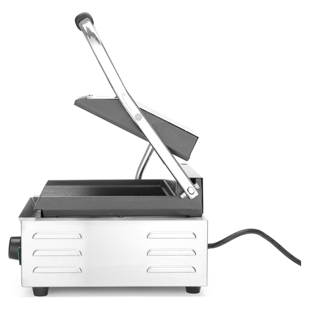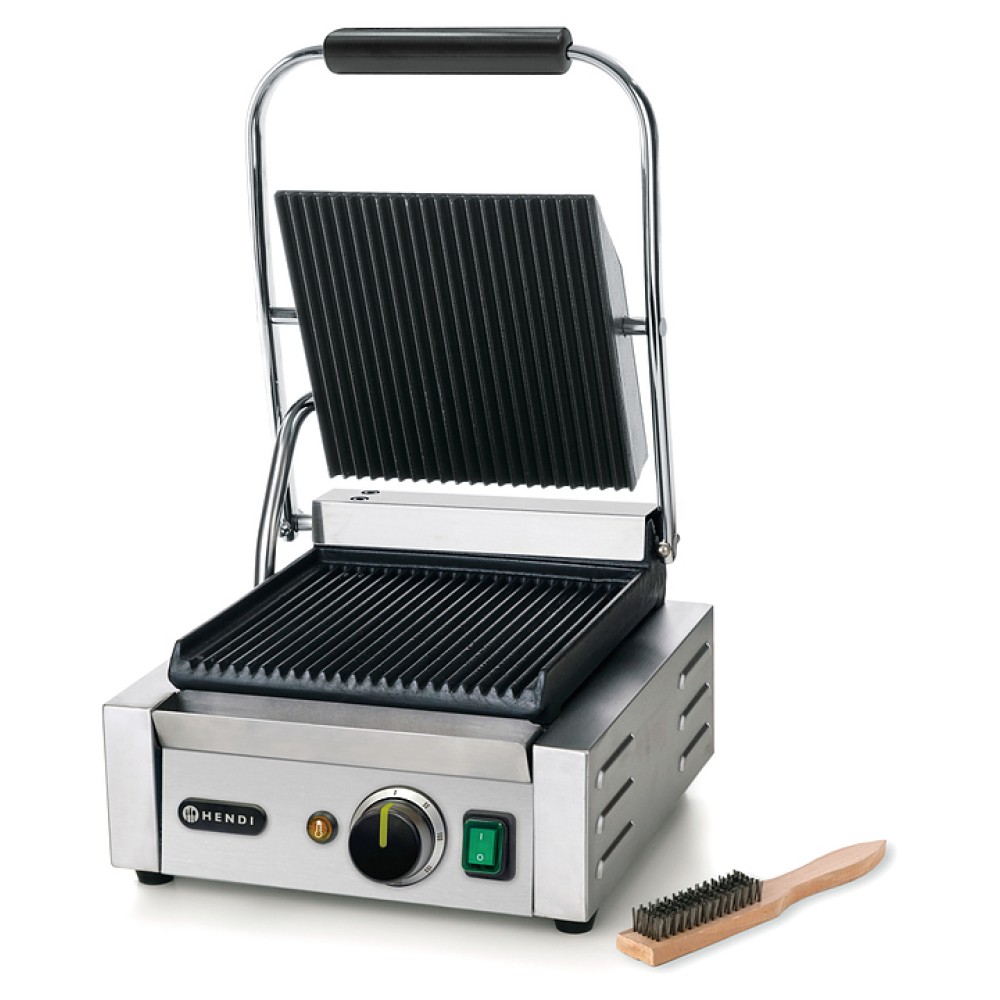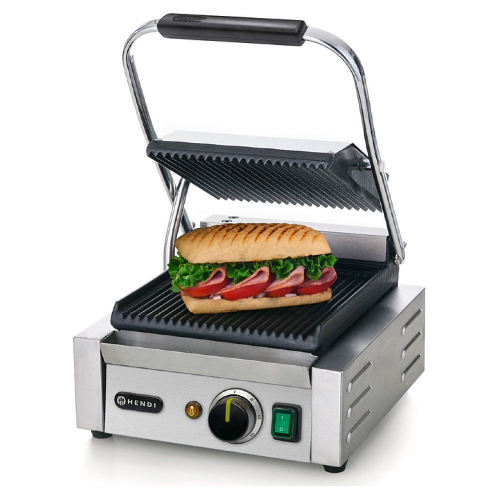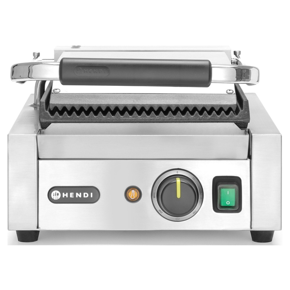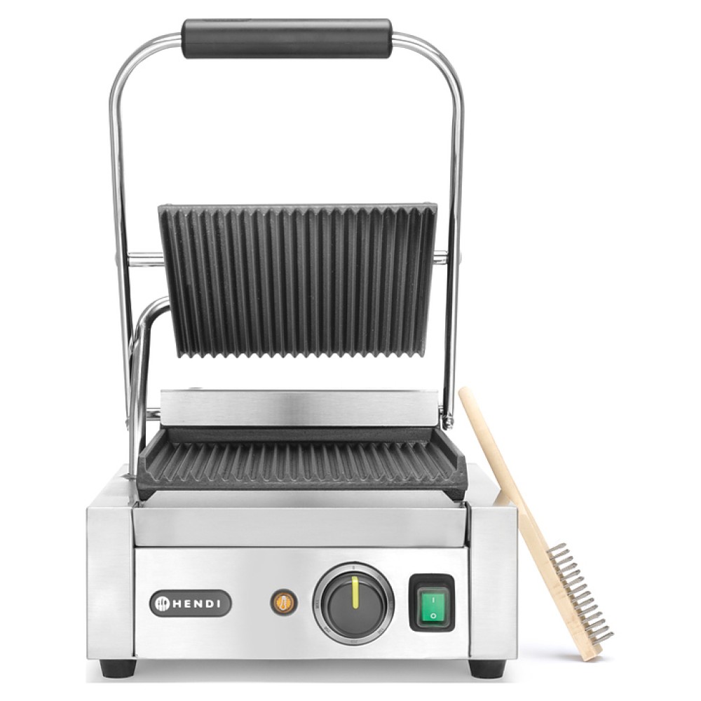 Контактный гриль HENDI 263501 предназначен для жарки мяса, птицы, рыбы, овощей, а также для приготовления стейков, сосисок, гамбургеров и горячих сэндвичей на предприятиях общественного питания и торговли. Модель оснащена термостатом с плавной регулировкой температуры, электромеханической панелью управления, сетевым выключателем, со встроенным индикатором, индикатором предварительного нагрева и кабелем питания с заземленной вилкой. Корпус выполнен из нержавеющей стали 18/10, ручки - из термостойкого материала, жарочная поверхность - из чугуна и имеет керамическое покрытие.