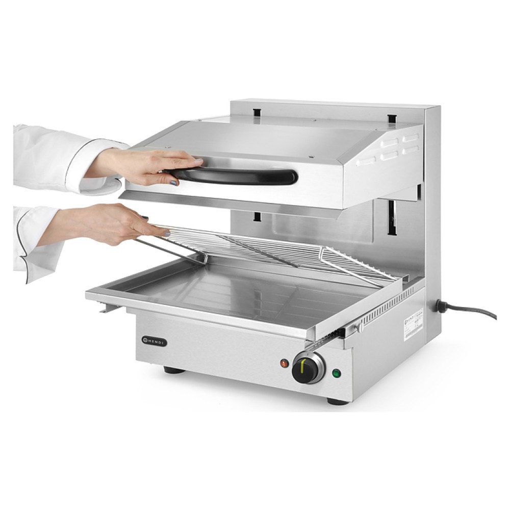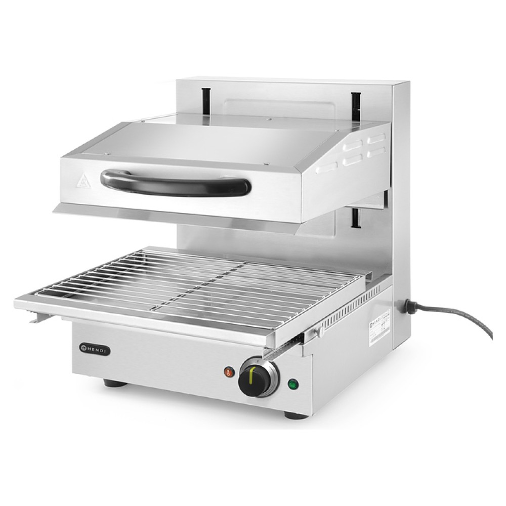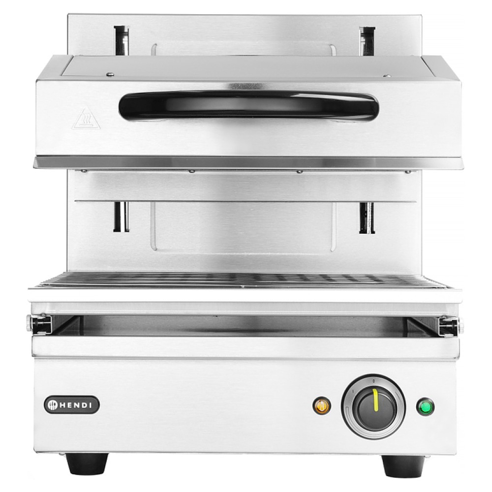 Гриль-саламандер HENDI 264607 предназначен для жарки мяса, птицы, рыбы, овощей, приготовления сендвичей и быстрого разогрева полуфабрикатов на предприятиях общественного питания и торговли. Модель оснащена выдвижным поддоном для сбора жира, индикатором температуры и устойчивыми ножками. Корпус выполнен из нержавеющей стали.