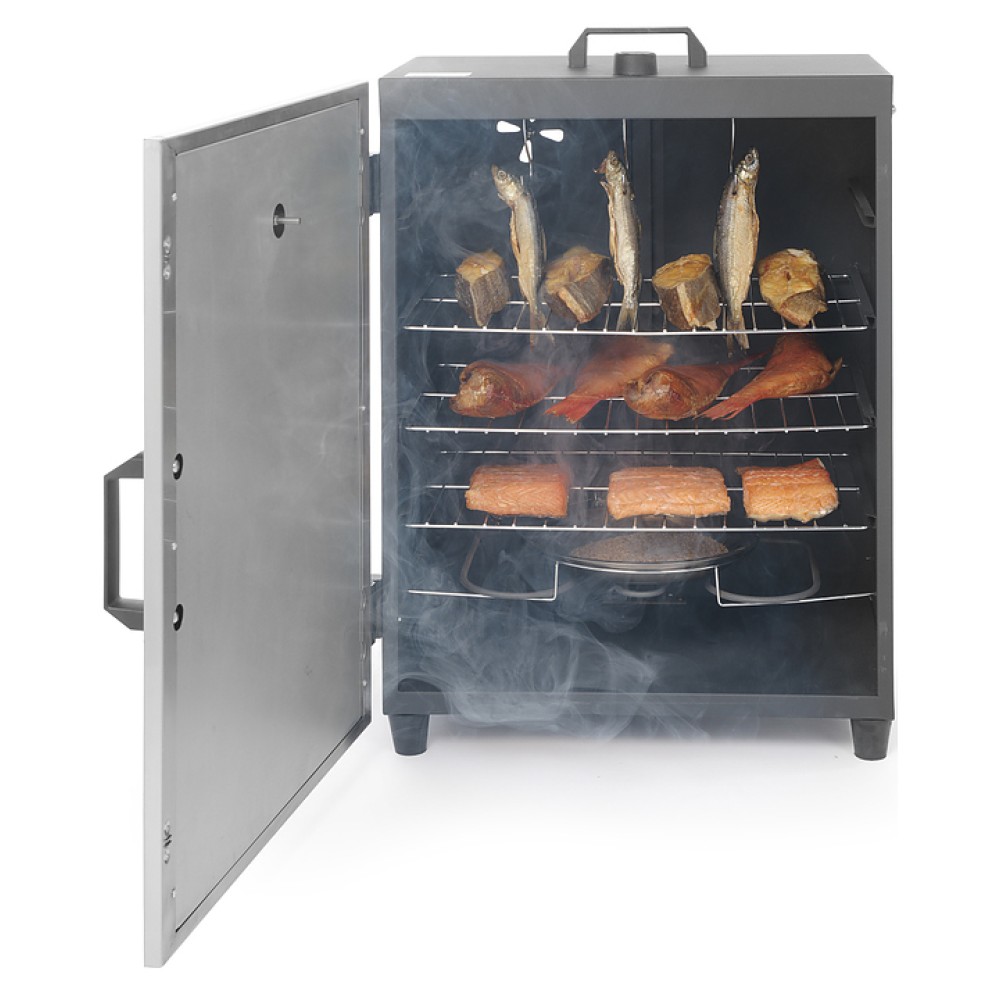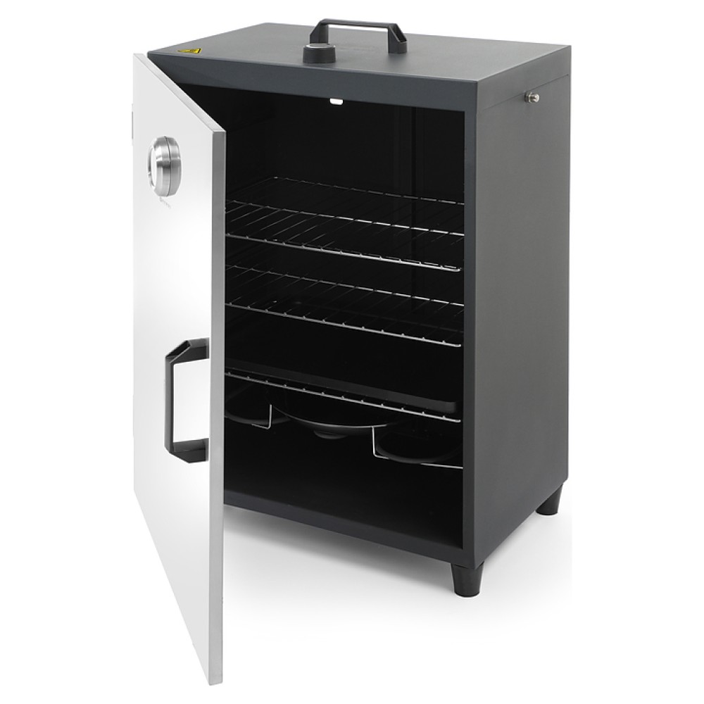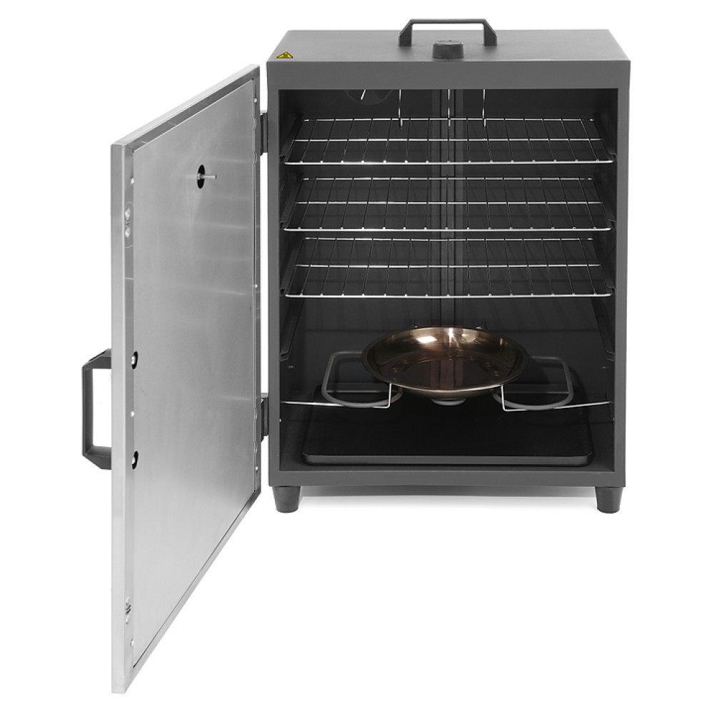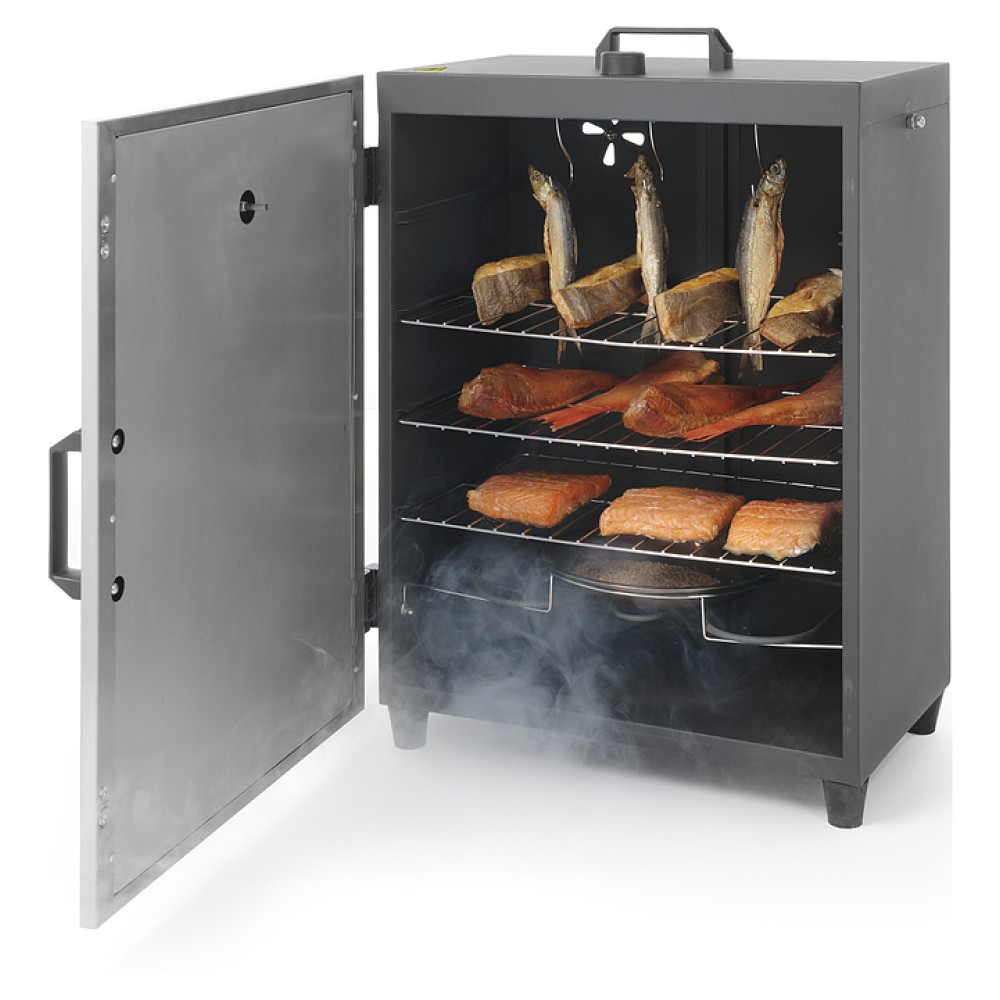 Коптильня HENDI 238486 используется на предприятиях общественного питания и торговли для горячего копчения мясных и рыбных продуктов. Модель оснащена термостатом для регулировки температуры, встроенным в дверь термометром, вентилляционной решеткой в задней части изделия, двойными изолированными дверями с магнитом и устойчивыми ножками. Изделие выполнено из нержавеющей стали