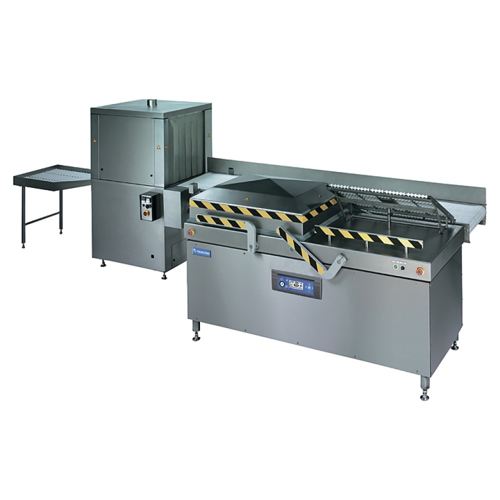 Вакуумная линия Henkovac А-5000L предназначена для автоматической вакуумной упаковки продуктов, полуфабрикатов и промтоваров с термоусадкой запаянных пакетов на предприятиях пищевой промышленности и торговли. Упаковщик рассчитан на крупные производства с большими объемами упаковываемой продукции и для групповой упаковки мясных продуктов весов до 30 кг с последующей усадкой пакета для транспортировки.