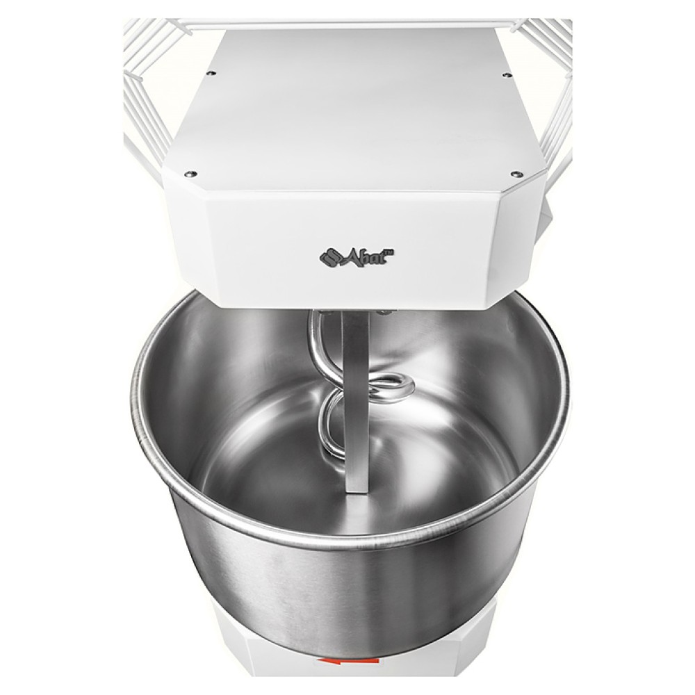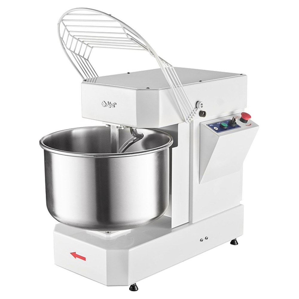 Корпус выполнен из высококачественной конструкционной стали с полимерным покрытием, металлические детали машины, контактирующие с продуктом во время замеса (спираль, дежа, нож) - из нержавеющей стали AISI 304.