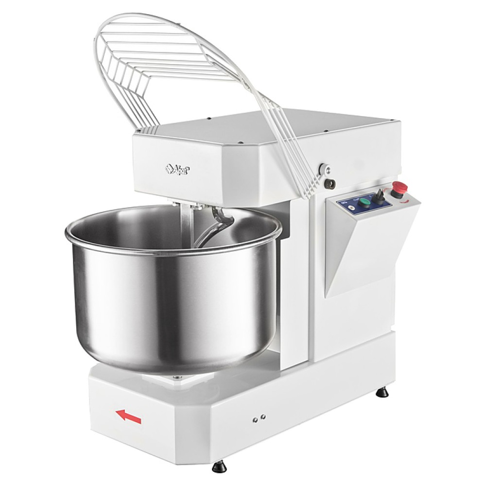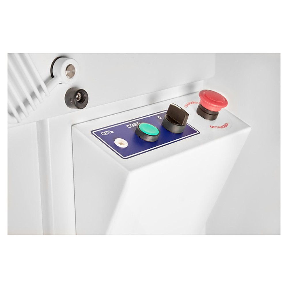 Корпус выполнен из высококачественной конструкционной стали с полимерным покрытием, металлические детали машины, контактирующие с продуктом во время замеса (спираль, дежа, нож) - из нержавеющей стали AISI 304.