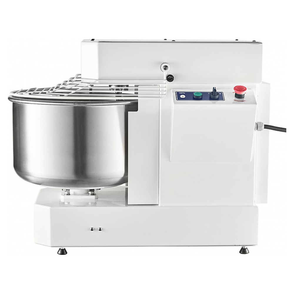 Корпус выполнен из высококачественной конструкционной стали с полимерным покрытием, металлические детали машины, контактирующие с продуктом во время замеса (спираль, дежа, нож) - из нержавеющей стали AISI 304.