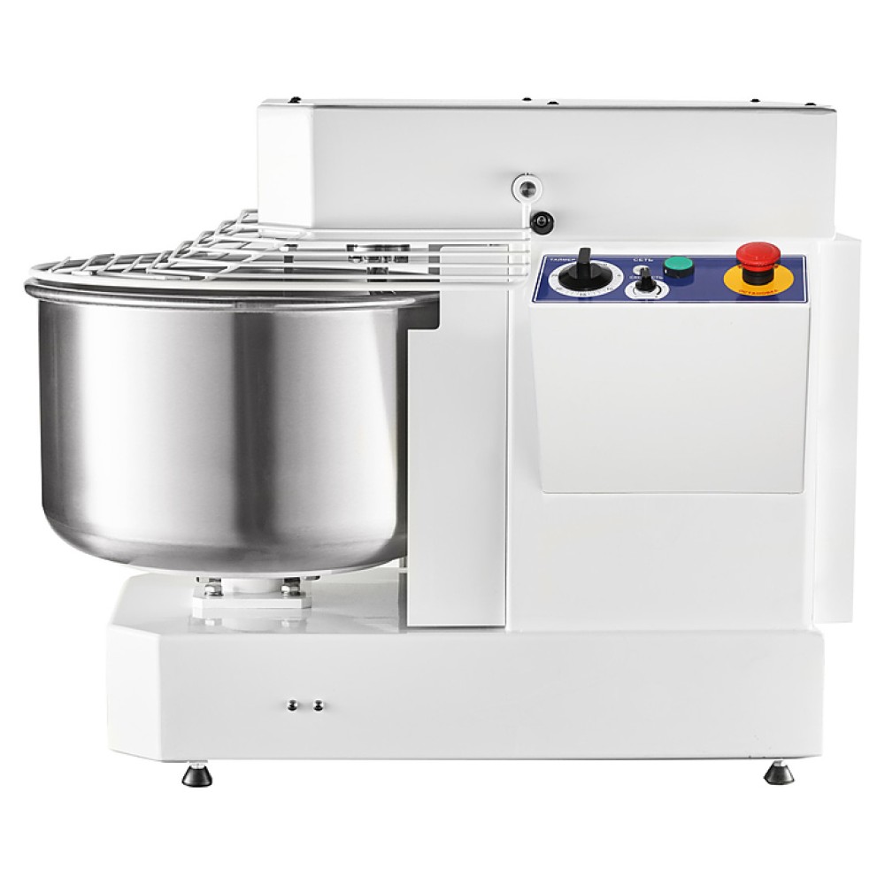 Корпус выполнен из высококачественной конструкционной стали с полимерным покрытием, металлические детали машины, контактирующие с продуктом во время замеса (спираль, дежа, нож) - из нержавеющей стали AISI 304.