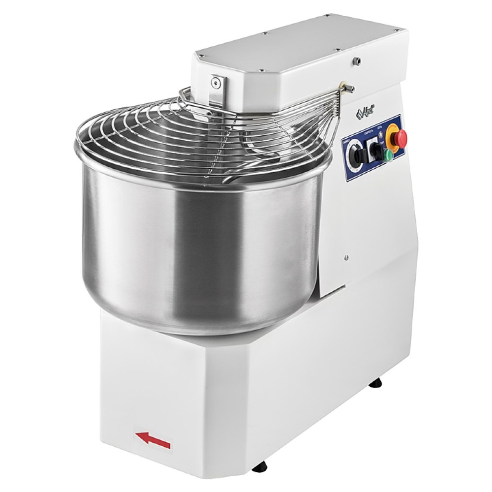Корпус выполнен из высококачественной конструкционной стали с полимерным покрытием, металлические детали машины, контактирующие с продуктом во время замеса (спираль, дежа, нож) - из нержавеющей стали AISI 304.