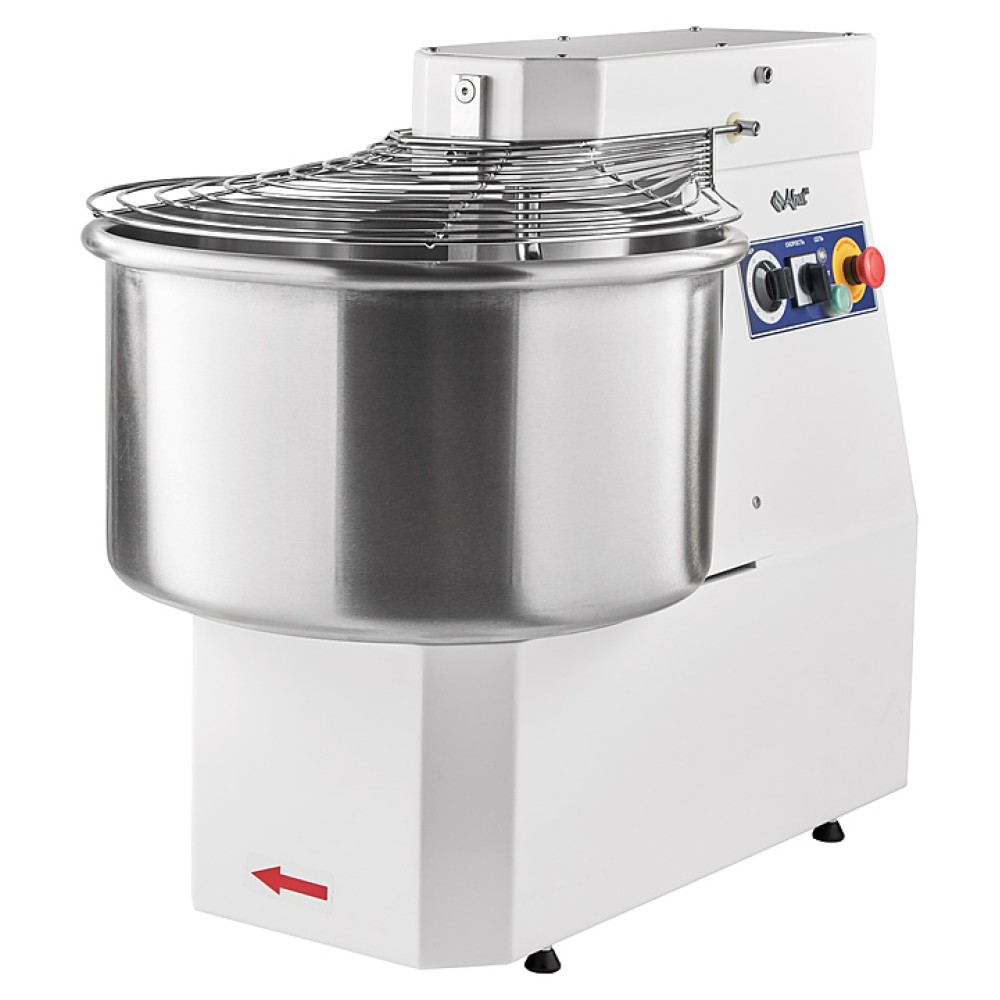 Корпус выполнен из высококачественной конструкционной стали с полимерным покрытием, металлические детали машины, контактирующие с продуктом во время замеса (спираль, дежа, нож) - из нержавеющей стали AISI 304.