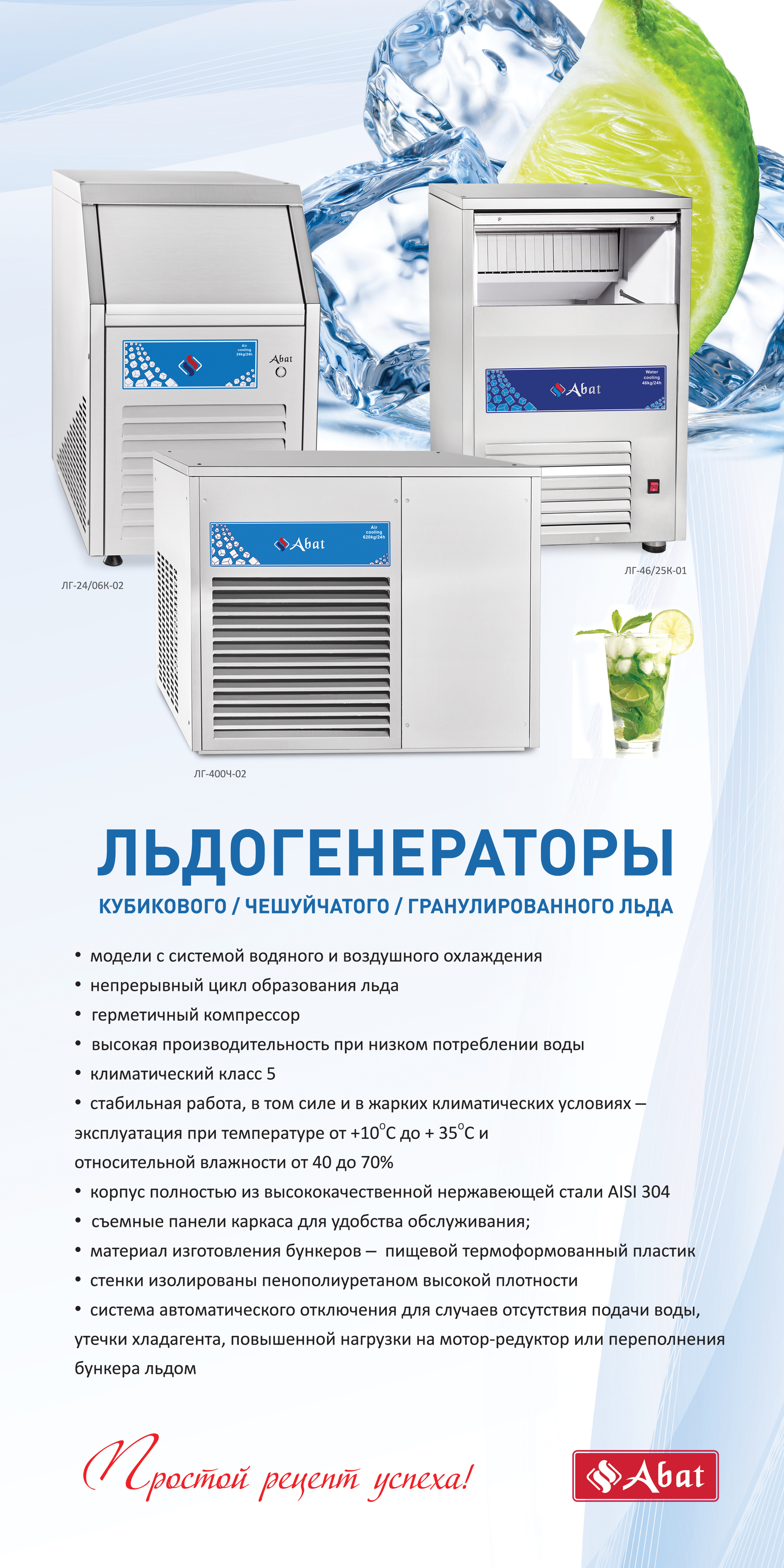 Льдогенератор Abat ЛГ-64/40К-01 предназначен для производства кубикового льда на предприятиях общественного питания и торговли. Модель оснащена компрессорным агрегатом и отодвигающейся вовнутрь дверцей. Каркас и облицовка за исключением задней стенки выполнены из высококачественной аустенитной нержавеющей стали марки AISI 304, контейнер для льда – из пищевого термоформованного пластика, термоизоляция – из пенополиуретана высокой плотности.