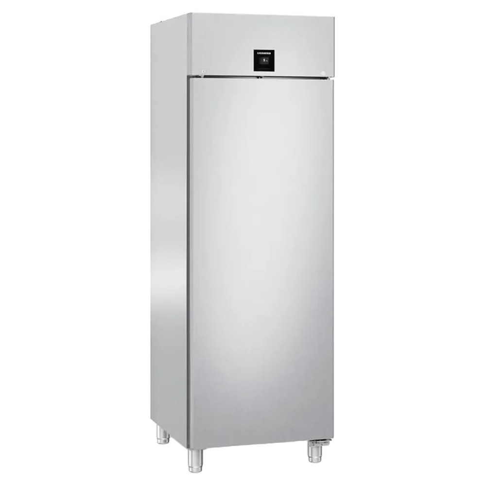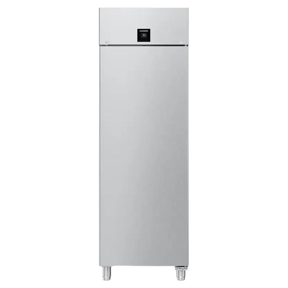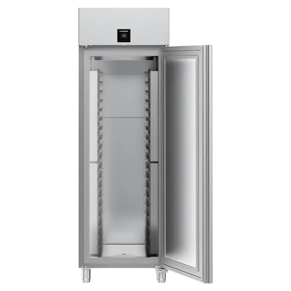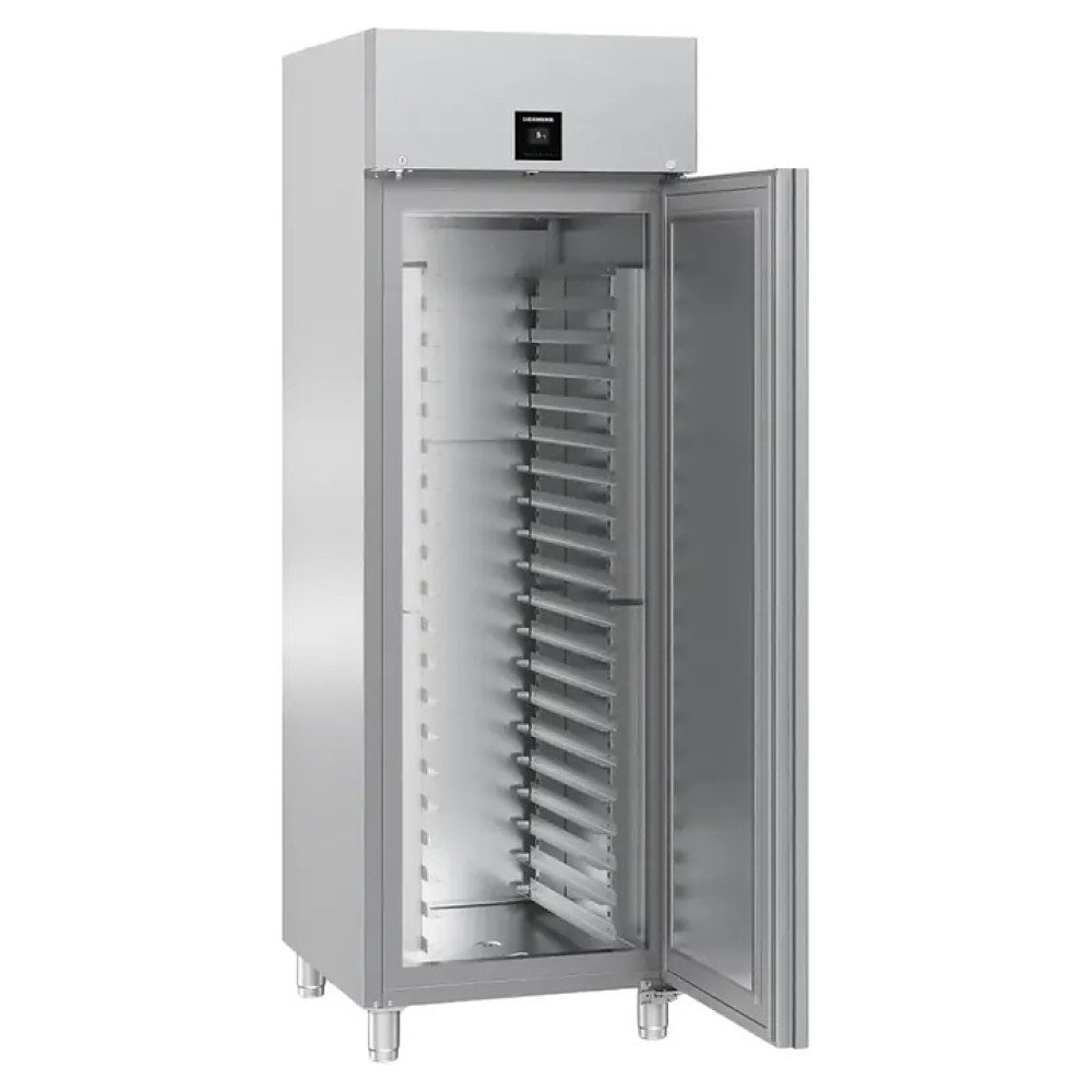 Холодильный шкаф Liebherr BRPSvh 6501 серии Perfection предназначен для охлаждения и хранения заготовок из теста в пекарнях и аналогичных предприятиях пищевой промышленности. Модель оснащена холодильной камерой c боковыми стойками с 20 уровнями L-образных направляющих для размещения противней, правосторонней глухой распашной дверью, 4 массивными цилиндрическими опорами, кабелем питания с вилкой и расположенной в верхней части фасада сенсорной панелью управления с дисплеем индикации. Боковины, дверь, внутренняя облицовка камеры, направляющие и опоры выполнены из хромникелевой нержавеющей стали марки AISI 304 с серебристой поверхностью, упаковка – из гофрокартона, полимерной пленки и полистирола.