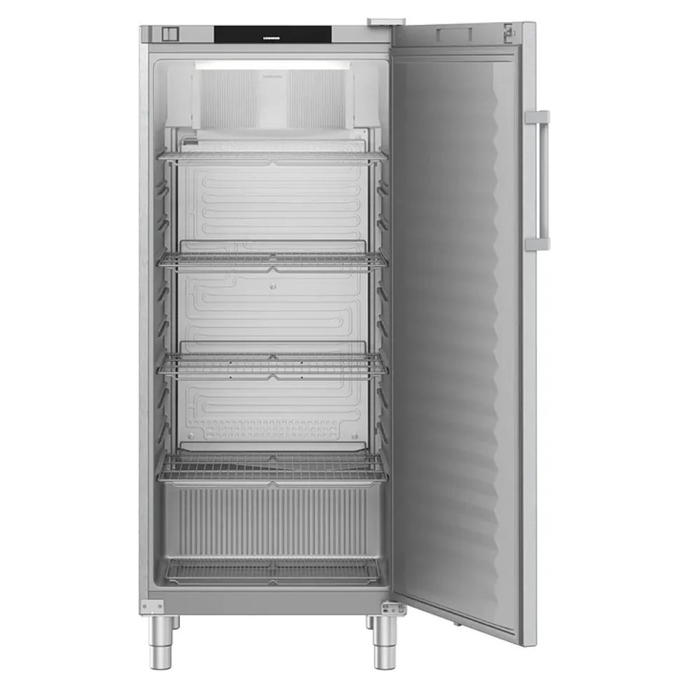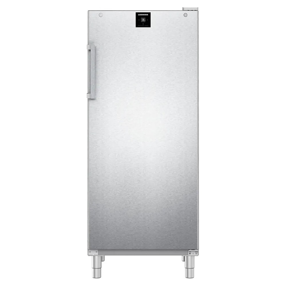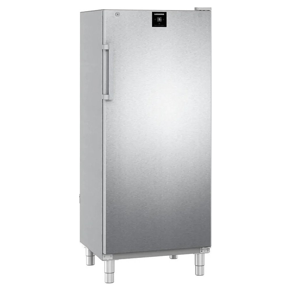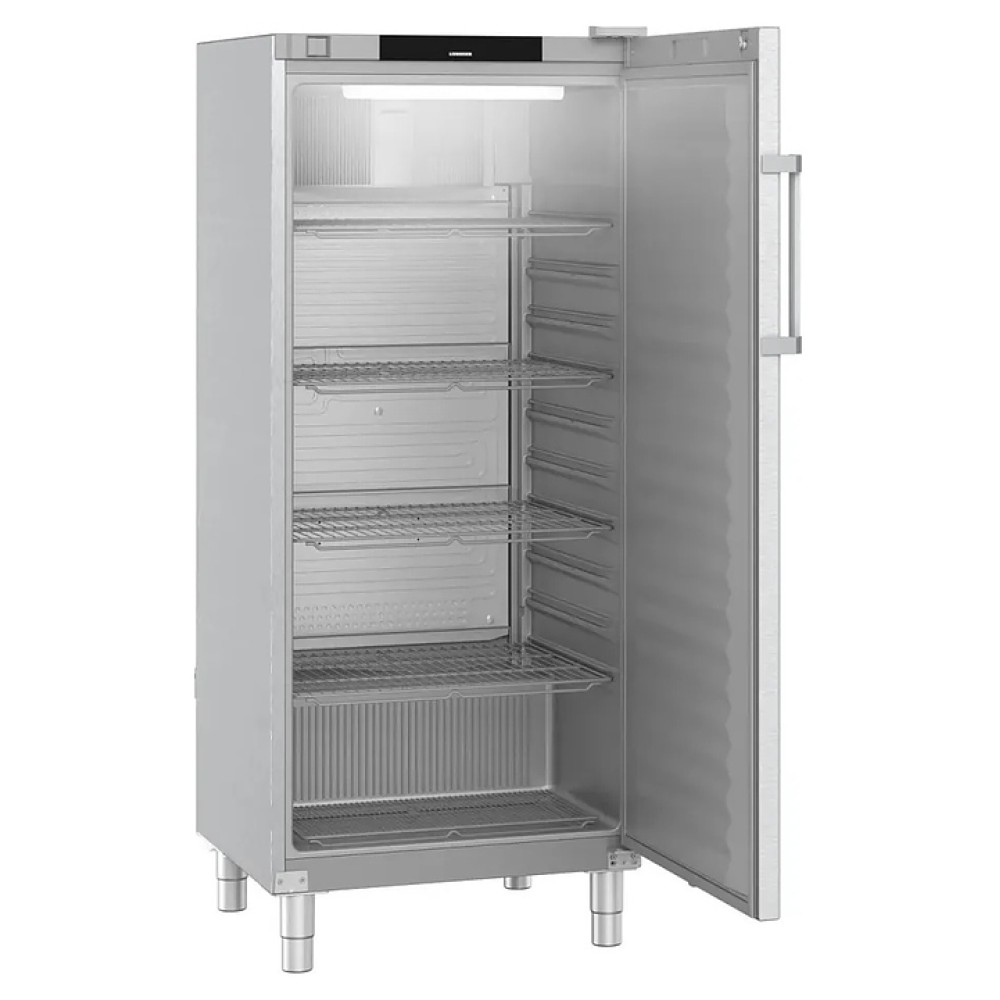 Холодильный шкаф Liebherr FRFCvg 5501 серии Perfection предназначен для охлаждения и хранения пищевых продуктов и напитков на предприятиях общественного питания и торговли. Модель оснащена холодильной камерой c правосторонней глухой распашной дверью с короткой вертикальной рукояткой, кабелем питания с вилкой, 4 массивными цилиндрическими опорами, расположенными в верхней части фронта за дверью и на фасаде двери сенсорными панелями управления с дисплеями индикации. Фасад двери, боковины и опоры выполнены из нержавеющей стали с серебристой поверхностью, внутренняя облицовка камеры – из пластика с серебристой поверхностью, рукоятка – из алюминия, полки – из металла с полимерным покрытием, упаковка – из гофрокартона, полимерной пленки и полистирола.