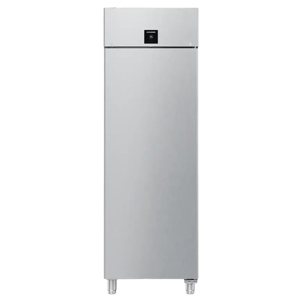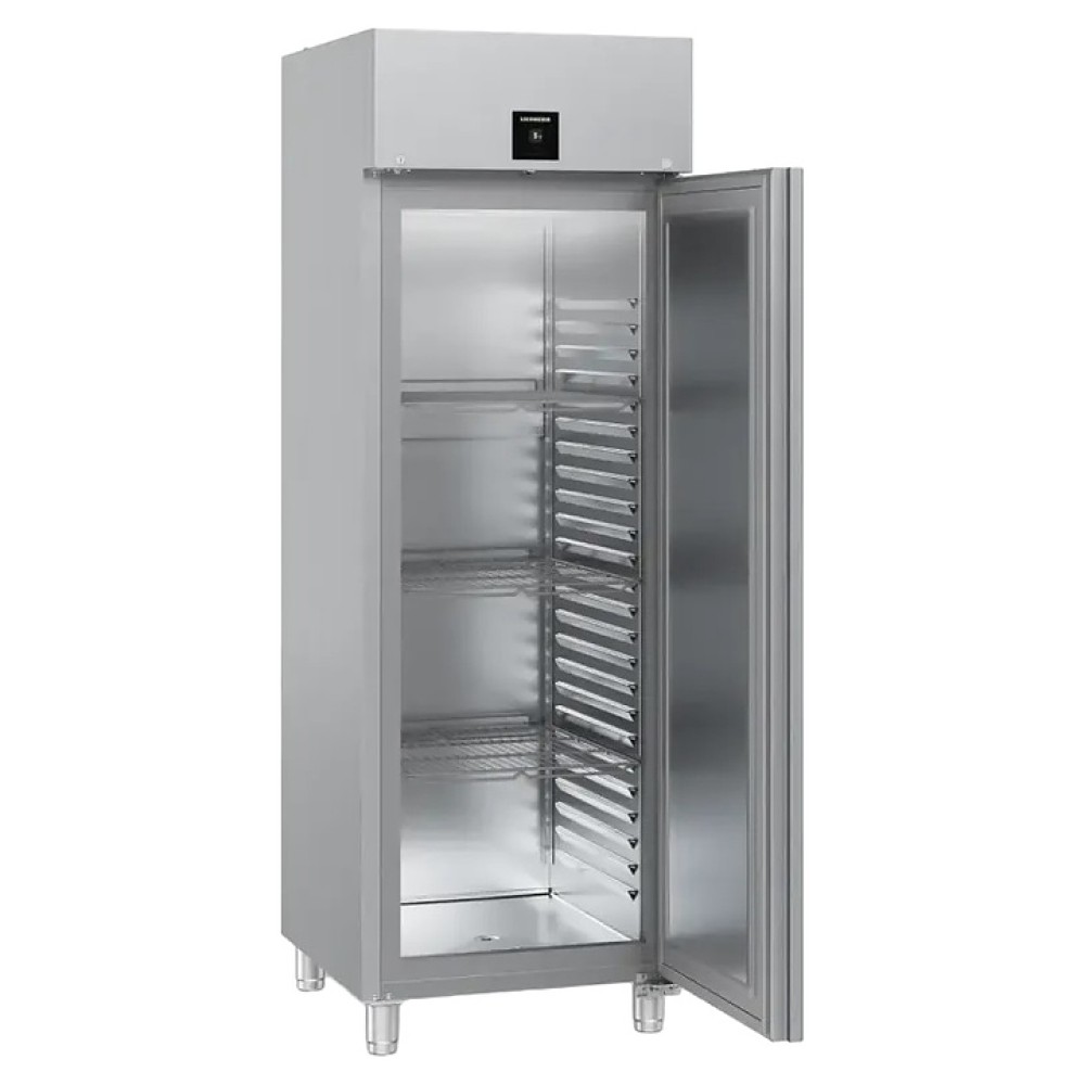 Холодильный шкаф Liebherr FRPSvg 6501 серии Performance предназначен для охлаждения и хранения пищевых продуктов и напитков на предприятиях общественного питания и торговли. Модель оснащена холодильной камерой c боковыми стойками с 20 уровнями L-образных направляющих для размещения противней, правосторонней глухой распашной дверью, 4 массивными цилиндрическими опорами, кабелем питания с вилкой и расположенной в верхней части фасада сенсорной панелью управления с дисплеем индикации. Боковины, дверь, внутренняя облицовка камеры, направляющие и опоры выполнены из хромникелевой нержавеющей стали марки AISI 304 с серебристой поверхностью, полки – из металла с полимерным покрытием, упаковка – из гофрокартона, полимерной пленки и полистирола.