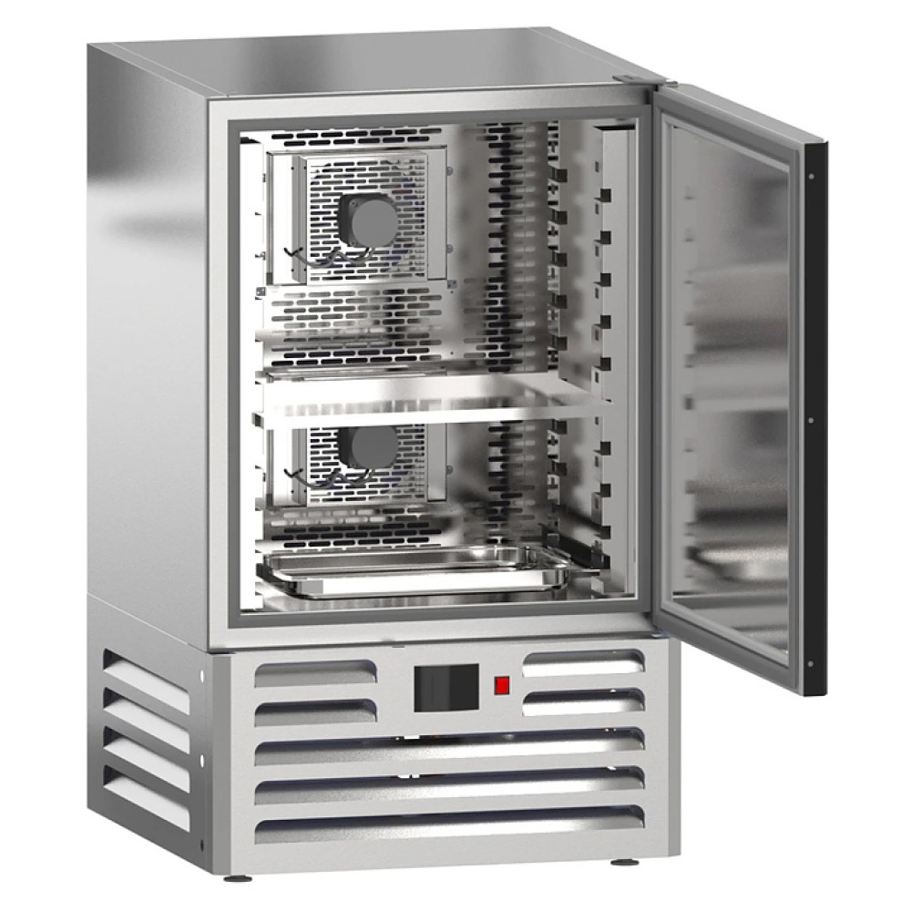 Шкаф шоковой заморозки KAYMAN SHOCKWIND ШШЗ-10 предназначен для быстрой заморозки продуктов и приготовленных блюд на предприятиях общественного питания и торговли. Модель оснащена электронным блоком управления, клапаном шредера, легкосъемными вертикальными стойками, направляющими полок и регулируемыми по высоте опорами. Цельнозаливной корпус выполнен из нержавеющей стали.