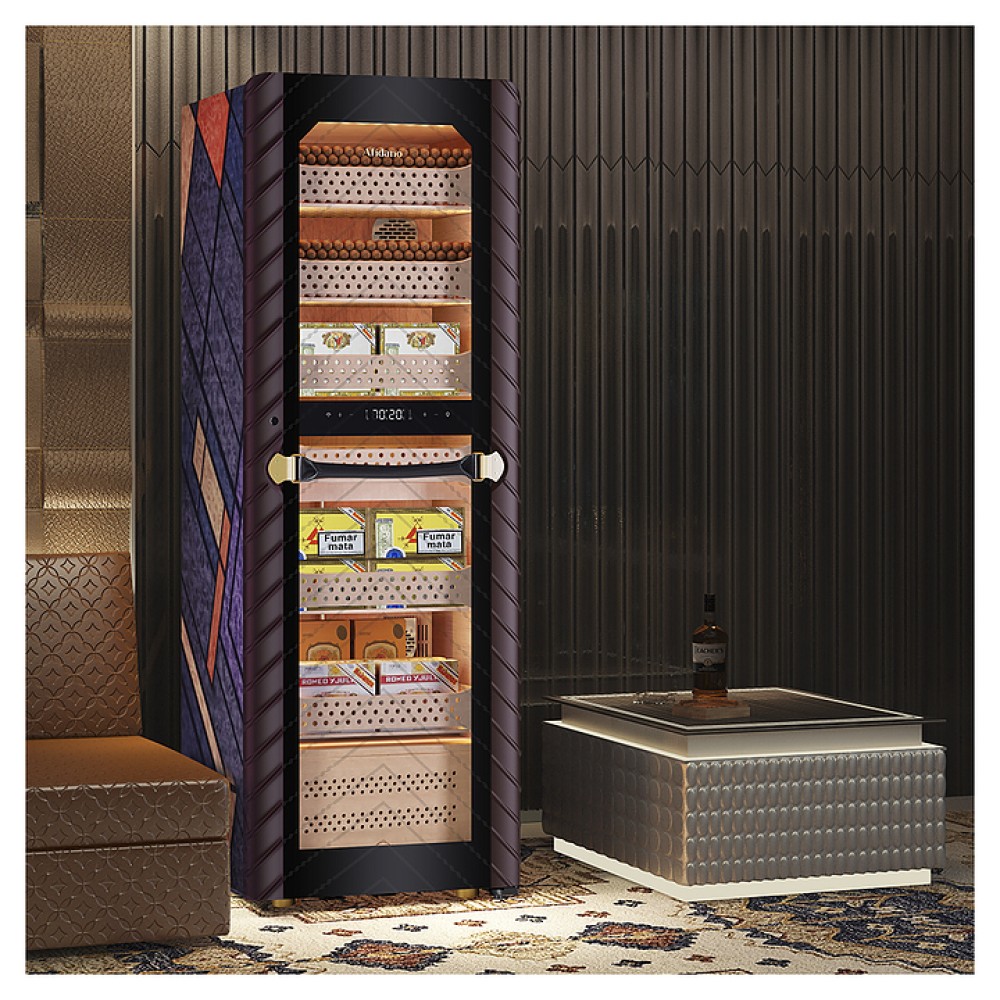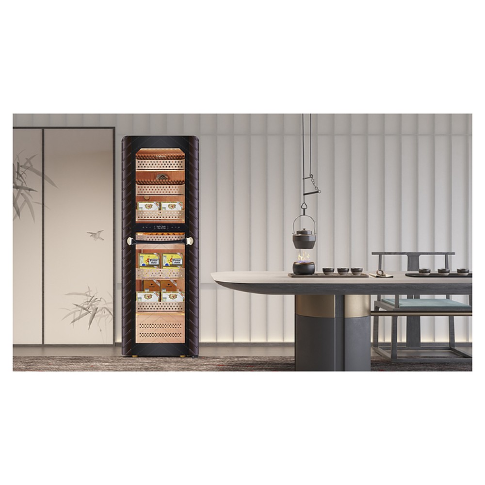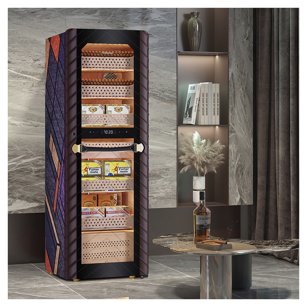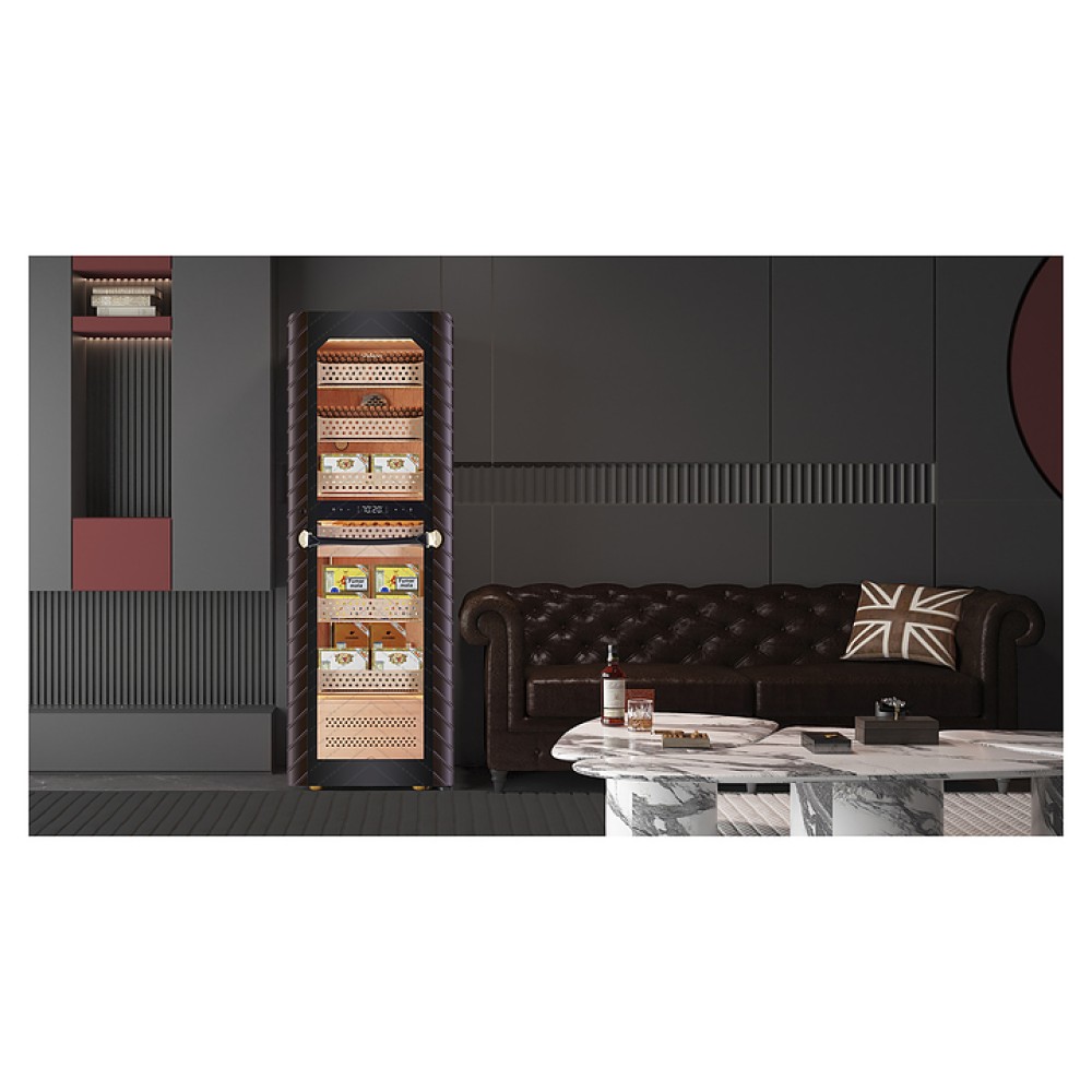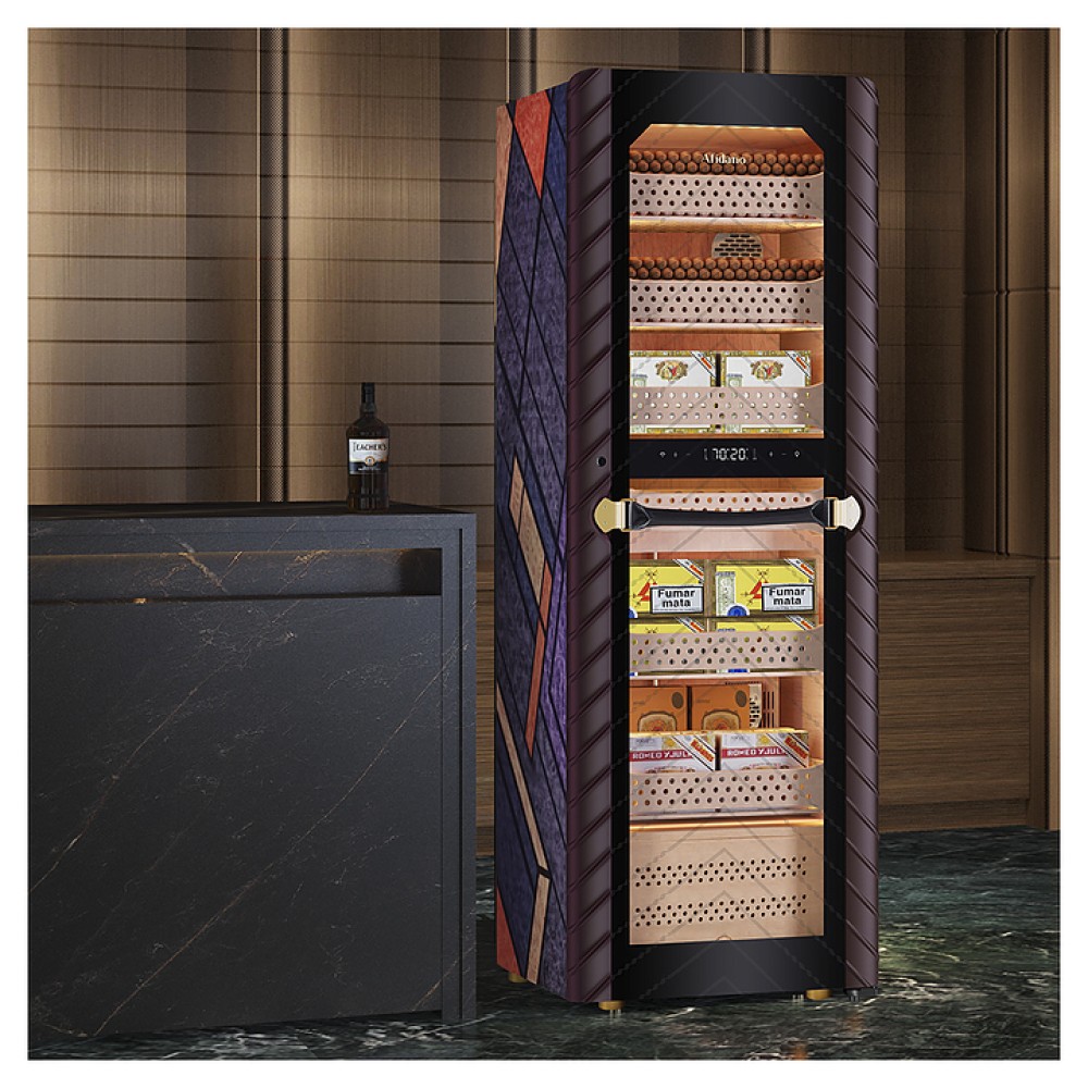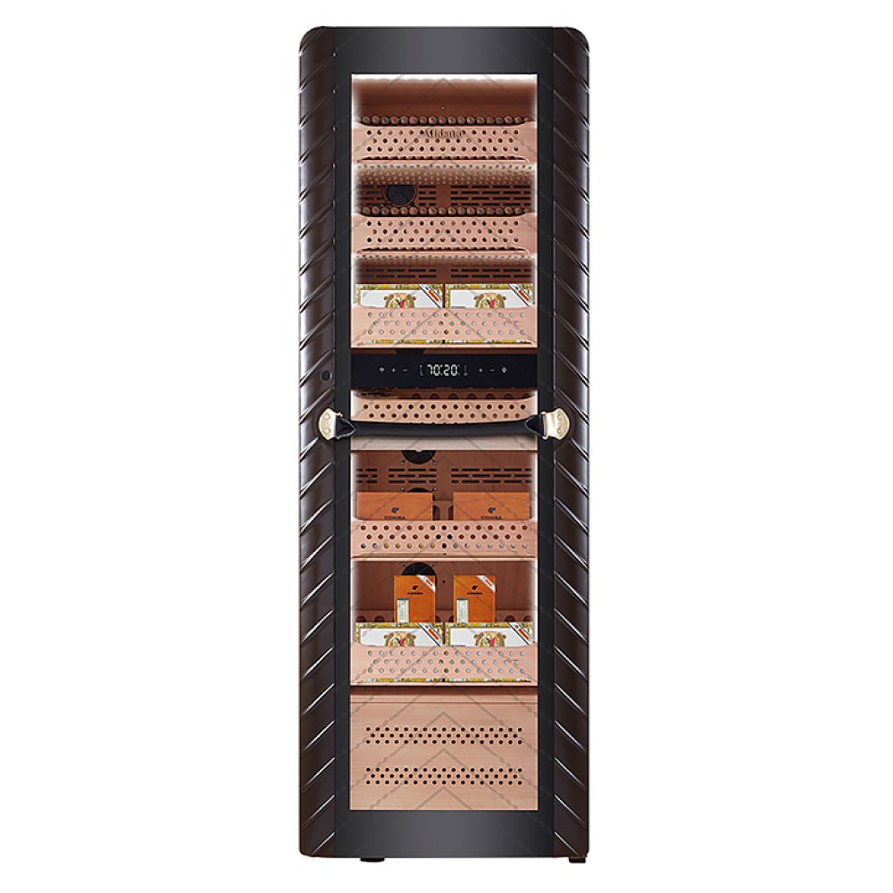 Шкаф Afidano C8 предназначен для хранения в оптимальных условиях и демонстрации сигар в специализированных магазинах, гостиницах, складских помещениях и домашних условиях. Модель оснащена 1 температурной зоной, сенсорной панелью управления, открытием отпечатком пальца, 6 выдвижными ящиками, электронным термостатом и регулируемыми ножками. Цифровой гигрометр и внутренняя подсветка упрощают мониторинг и обзор содержимого. Корпус выполнен из стали, обшитой скульптурным полотном, ручка - из стали, обшитой кожей, внутренняя отделка и ящики - из испанского кедра.