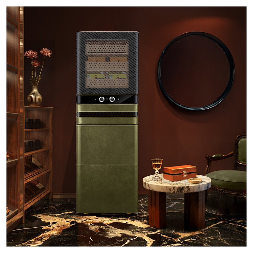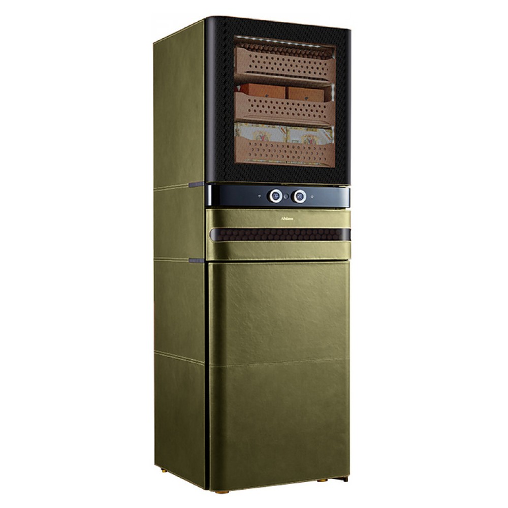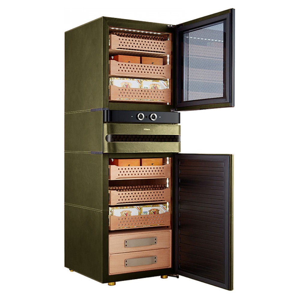 Шкаф Afidano L8 предназначен для хранения в оптимальных условиях и демонстрации сигар в специализированных магазинах, гостиницах, складских помещениях и домашних условиях. Модель оснащена 1 температурной зоной, 3 дверьми, 9 выдвижными ящиками, открытием отпечатком пальца, сенсорной панелью управления, утопленной ручкой, электронным термостатом и регулируемыми ножками. Цифровой гигрометр и внутренняя подсветка упрощают мониторинг и обзор содержимого. Корпус выполнен из стали, обшитой кожей, внутренняя отделка и ящики - из испанского кедра.