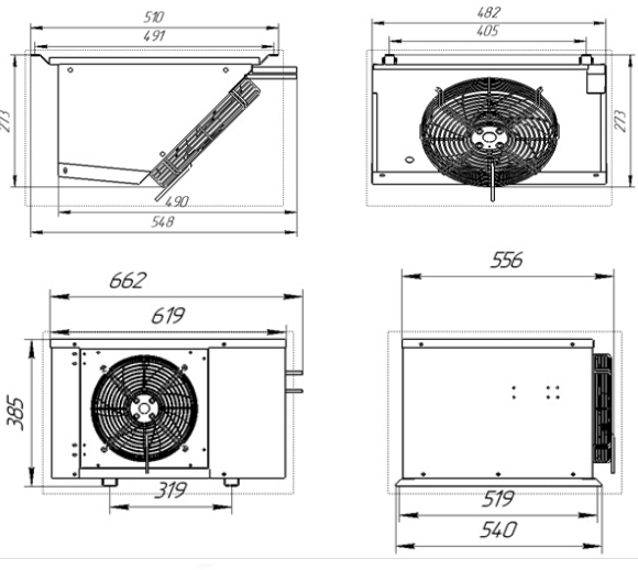 Низкотемпературная сплит-система Intercold LCM 109 FT серии «Стандарт» предназначена для охлаждения и поддержания необходимого температурного режима во внутреннем объеме холодильных камер на предприятиях пищевой промышленности. Модель оснащена внешним блоком с установленным компрессором, пластинчато-трубчатым конденсатором, воздухоохладителем с установленными ТЭНами и вентиляторами, щитом управления с контроллером и силовой частью. Корпус выполнен из окрашенной оцинкованной стали, воздухоохладитель - из алюминия.