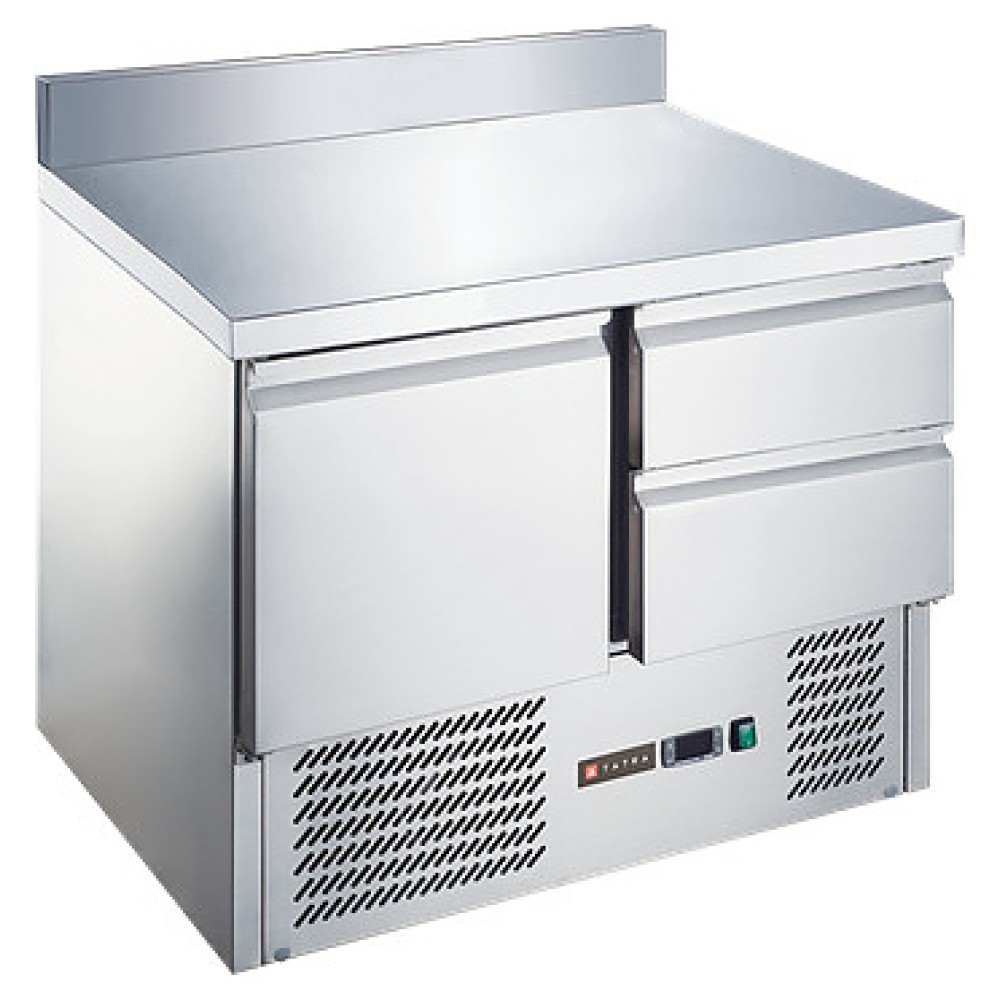 Холодильный стол Tatra TRTGNL1D2 TN SB предназначен для хранения предварительно охлажденных мясных и рыбных полуфабрикатов, заготовок для салатов, молочной продукции, напитков, а также раскатки теста и обработки пищевых продуктов на предприятиях общественного питания и торговли. Модель оснащена встроенным компрессорным холодильным агрегатом с нижним расположением, расположенными в нижней части фронтальной стенки электронным контроллером с цифровым дисплеем индикации, столешницей с задним бортом, холодильной камерой с 2 секциями: 1 – с распашной дверью и 1 – с 2 выдвижными ящиками. Корпус выполнен из высококачественной нержавеющей стали.