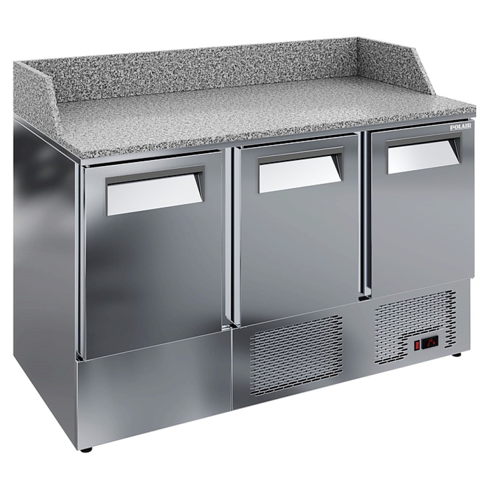 Холодильный стол для пиццы POLAIR TMi3GNpizza-GC предназначен для раскатки теста, хранения продуктов и обработки ингредиентов для приготовления пиццы на рабочей поверхности на предприятиях общественного питания и торговли. Внешняя (кроме задней стенки) и внутренняя обшивка цельнозаливного корпуса и двери выполнены из нержавеющей стали и обеспечивают механическую прочность, термоизоляцию, герметичность и долговечность стола, столешница и борт - из натурального гранита, теплоизоляция - из пенополиуретана, полки - из окрашенной оцинкованной проволоки. Оборудование рассчитано на работу при температуре окружающей среды до 43 °С.
