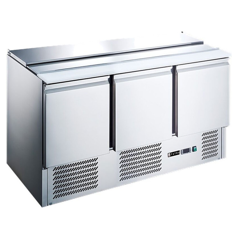 Стол Tatra TSLGNL3 NC предназначен для кратковременного хранения ингредиентов и приготовления салатов, холодных закусок, сэндвичей и других блюд на предприятиях общественного питания и торговли. Модель оснащена встроенным холодильным агрегатом с боковым расположением, цифровым термостатом, 3 глухими дверьми с магнитным уплотнителем и регулируемыми по высоте ножками. Корпус выполнен из высококачественной нержавеющей стали, столешница для нарезки - из нейлона.