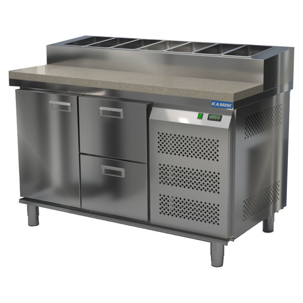 Холодильный стол КАМИК СОП-К-121476 используется на предприятиях общественного питания и торговли для охлаждения и хранения продуктов, напитков и готовых блюд, а также для раскатки теста и обработки ингредиентов для приготовления пиццы. Конструкция разделена на секции, каждая секция с дверью оборудована сетчатой полкой и парой направляющих. Корпус выполнен из нержавеющей стали AISI 430 толщиной 1 мм, столешница - из камня.