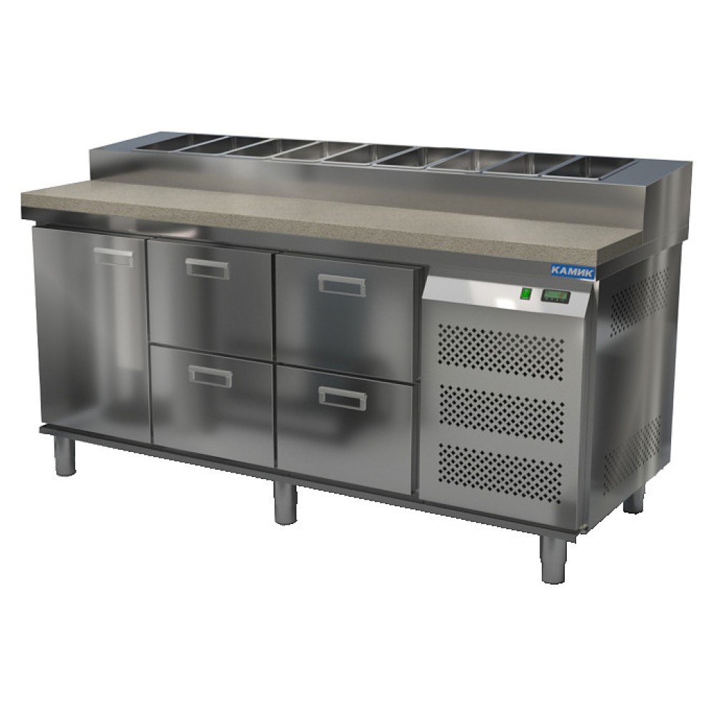 Холодильный стол КАМИК СОП-К-1418573 используется на предприятиях общественного питания и торговли для охлаждения и хранения продуктов, напитков и готовых блюд, а также для раскатки теста и обработки ингредиентов для приготовления пиццы. Конструкция разделена на секции, каждая секция с дверью оборудована сетчатой полкой и парой направляющих. Корпус выполнен из нержавеющей стали AISI 430 толщиной 1 мм, столешница - из камня.