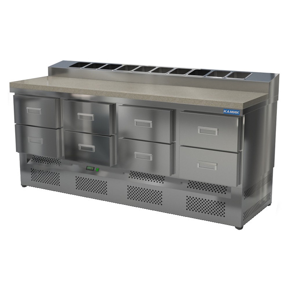 Холодильный стол КАМИК СОПН-К-082073 используется на предприятиях общественного питания и торговли для охлаждения и хранения продуктов, напитков и готовых блюд, а также для раскатки теста и обработки ингредиентов для приготовления пиццы. Конструкция разделена на секции, каждая секция с дверью оборудована сетчатой полкой и парой направляющих. Корпус выполнен из нержавеющей стали AISI 430 толщиной 1 мм, столешница - из камня.