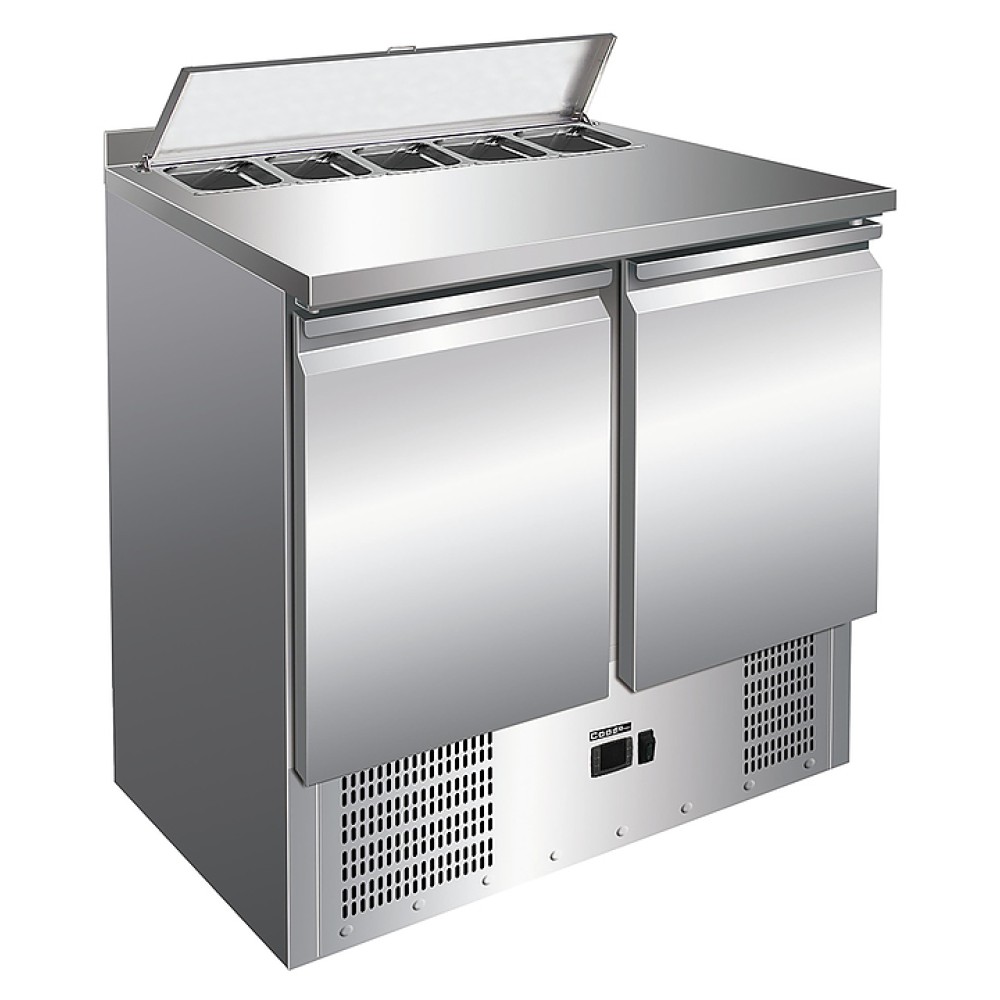 Холодильный стол Cooleq S901-5GN 1/6 предназначен для хранения и приготовления салатов и других блюд на предприятиях общественного питания. Модель оснащена агрегатным отсеком снизу, столешницей с бортом, 2 холодильными камерами с дверьми, 1 полкой и 1 парой направляющих под GN 1/1 в каждой секции. Столешница служит рабочей поверхностью, что экономит пространство. Корпус выполнен из нержавеющей стали, отличающейся прочностью и долговечностью, не впитывает загрязнения и легко очищается.
