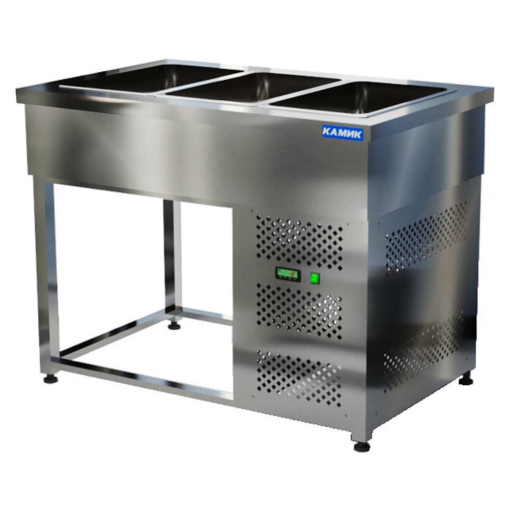 Холодильный стол КАМИК СОН-111000 используется на предприятиях общественного питания и торговли для охлаждения, демонстрации и кратковременного хранения ингредиентов для приготовления салатов, напитков и готовых блюд. Конструкция имеет модульное строение и разделена на секции, каждая секция с дверью оборудована сетчатой полкой и парой направляющих. Корпус выполнен из нержавеющей стали.