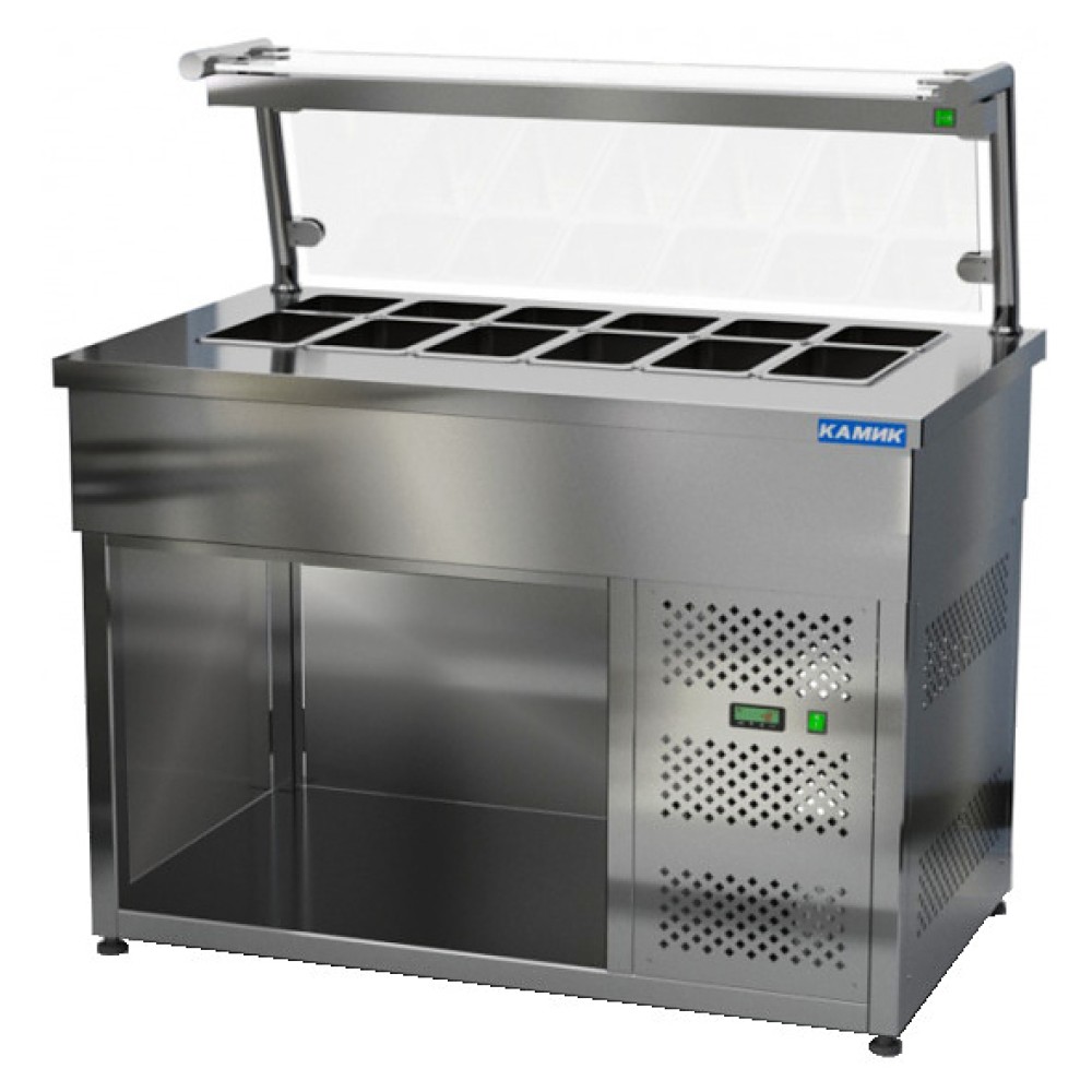 Холодильный стол КАМИК СОН-112001 используется на предприятиях общественного питания и торговли для охлаждения, демонстрации и кратковременного хранения ингредиентов для приготовления салатов, напитков и готовых блюд. Конструкция имеет модульное строение и разделена на секции, каждая из которых оборудована сетчатой полкой и парой направляющих. Корпус выполнен из нержавеющей стали.