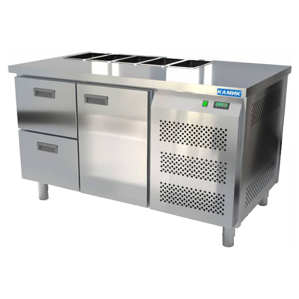 Холодильный стол КАМИК СОН-121476К используется на предприятиях общественного питания и торговли для охлаждения, демонстрации и кратковременного хранения ингредиентов для приготовления салатов, напитков и готовых блюд. Конструкция разделена на секции, каждая секция с дверью оборудована сетчатой полкой и парой направляющих. Корпус выполнен из нержавеющей стали AISI 430 толщиной 1 мм, столешница - из нержавеющей стали AISI 304 толщиной 1,5 мм.