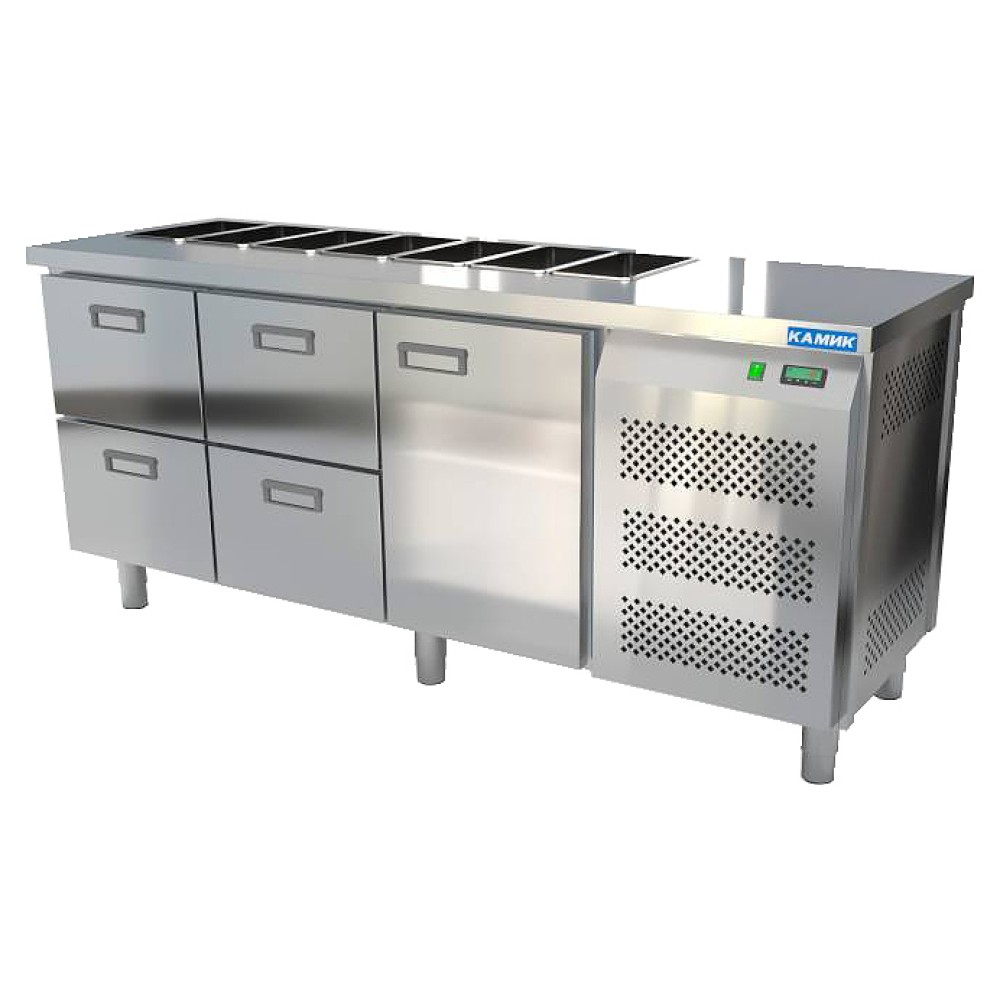 Холодильный стол КАМИК СОН-1418573К используется на предприятиях общественного питания и торговли для охлаждения, демонстрации и кратковременного хранения ингредиентов для приготовления салатов, напитков и готовых блюд. Конструкция разделена на секции, каждая секция с дверью оборудована сетчатой полкой и парой направляющих. Корпус выполнен из нержавеющей стали AISI 430 толщиной 1 мм, столешница - из нержавеющей стали AISI 304 толщиной 1,5 мм.