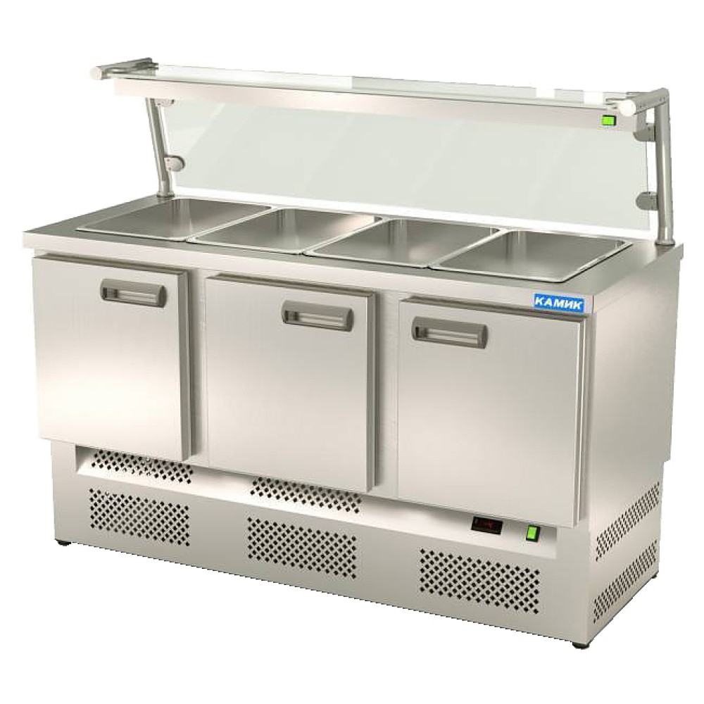 Холодильный стол КАМИК СОН-215051 используется на предприятиях общественного питания и торговли для охлаждения, демонстрации и кратковременного хранения ингредиентов для приготовления салатов, напитков и готовых блюд. Конструкция имеет модульное строение и разделена на секции, каждая секция с дверью оборудована сетчатой полкой и парой направляющих. Корпус выполнен из нержавеющей стали.