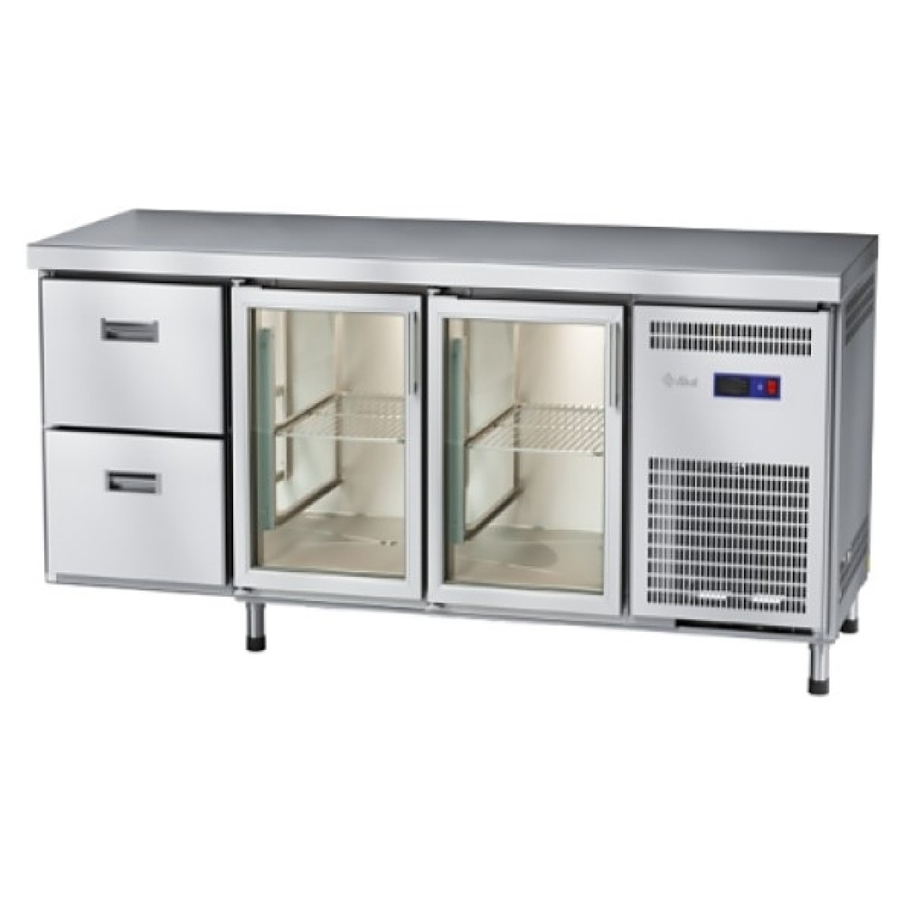 Холодильный стол Abat СХС-60-02 предназначен для раскатки теста, обработки ингредиентов для приготовления блюд, охлаждения и кратковременного хранения скоропортящихся продуктов и напитков на предприятиях общественного питания и торговли. Модель оснащена неохлаждаемой рабочей поверхностью, 2 распашными стеклянными дверцами с уплотнителями с магнитной вставкой (слева и посередине), 2 ящиками справа и регулируемыми по высоте ножками.