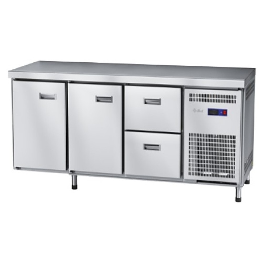 Холодильный стол Abat СХС-60-02 предназначен для раскатки теста, обработки ингредиентов для приготовления блюд, охлаждения и кратковременного хранения скоропортящихся продуктов и напитков на предприятиях общественного питания и торговли. Модель оснащена неохлаждаемой рабочей поверхностью, 2 ящиками слева, 2 распашными дверцами с уплотнителями с магнитной вставкой (посередине и справа) и регулируемыми по высоте ножками.