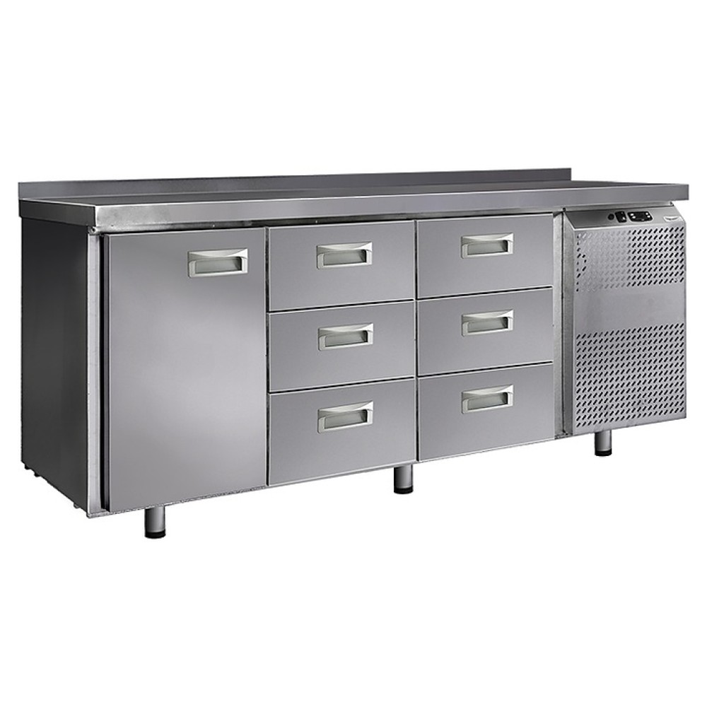 Холодильный стол Finist СХС-600-1/6 предназначен для хранения предварительно охлажденных мясных и рыбных полуфабрикатов, заготовок для салатов, молочной продукции, охлажденных напитков и других пищевых продуктов на предприятиях общественного питания и торговли. Модель оснащена расположенным сбоку агрегатным отсеком, столешницей с задним бортом, холодильной камерой с распашной дверцей, 6 выдвижными ящиками, устойчивыми ножками с подпятниками, кабелем питания с евровилкой и кнопочной панелью управления с цифровым дисплеем. Корпус выполнен из высококачественной нержавеющей стали.