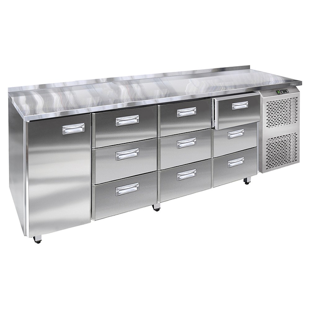 Холодильный стол Finist СХС-600-1/9 предназначен для хранения пищевых продуктов и напитков на предприятиях общественного питания, торговли и пищевых производствах. Модель оснащена распашной дверью и 9 выдвижными ящиками с доводчиками, обеспечивающими гарантированное закрытие и поддержание заданной температуры в рабочем объеме стола. Передняя панель моторного отсека имеет большую площадь перфорации, что позволяет обеспечить холодильному агрегату поступление воздуха для охлаждения. Изделие выполнено из высококачественной пищевой нержавеющей стали, которая отличается прочностью и долговечностью, не впитывает загрязнения и легко очищается.
