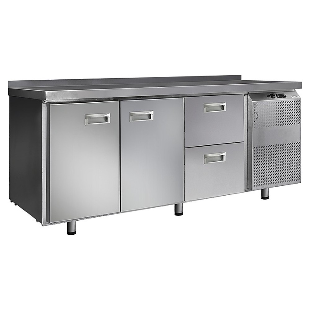 Холодильный стол Finist СХС-600-2/2 предназначен для хранения предварительно охлажденных мясных и рыбных полуфабрикатов, заготовок для салатов, молочной продукции, охлажденных напитков и других пищевых продуктов на предприятиях общественного питания и торговли. Модель оснащена расположенным сбоку агрегатным отсеком, столешницей с задним бортом, 2 холодильными камерами с распашными дверцами, 2 выдвижными ящиками, устойчивыми ножками с подпятниками, кабелем питания с евровилкой и кнопочной панелью управления с цифровым дисплеем. Корпус выполнен из высококачественной нержавеющей стали.