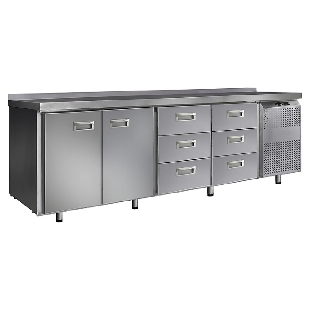 Холодильный стол Finist СХС-600-2/6, среднетемпературный, с боковым расположением агрегата предназначен для хранения предварительно охлажденных мясных и рыбных полуфабрикатов, заготовок для салатов, молочной продукции, охлажденных напитков и других пищевых продуктов на предприятиях общественного питания и торговли. Модель оснащена расположенным сбоку агрегатным отсеком, столешницей с задним бортом, 2 холодильными камерами с распашными дверцами, 6 выдвижными ящиками, устойчивыми ножками с подпятниками, кабелем питания с евровилкой и кнопочной панелью управления с цифровым дисплеем. Корпус выполнен из высококачественной нержавеющей стали.