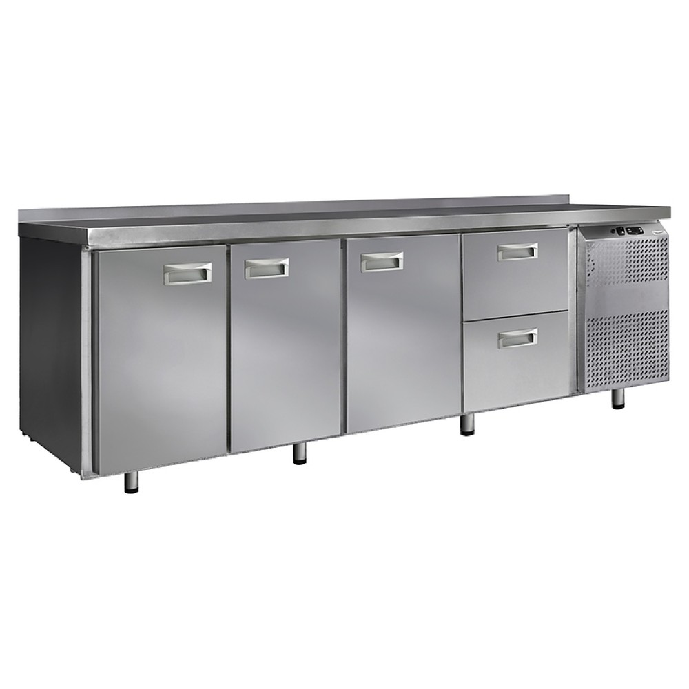 Холодильный стол Finist СХС-600-3/2, среднетемпературный, с боковым расположением агрегата предназначен для хранения предварительно охлажденных мясных и рыбных полуфабрикатов, заготовок для салатов, молочной продукции, охлажденных напитков и других пищевых продуктов на предприятиях общественного питания и торговли. Модель оснащена расположенным сбоку агрегатным отсеком, столешницей с задним бортом, 3 холодильными камерами с распашными дверцами, 2 выдвижными ящиками, устойчивыми ножками с подпятниками, кабелем питания с евровилкой и кнопочной панелью управления с цифровым дисплеем. Корпус выполнен из высококачественной нержавеющей стали.
