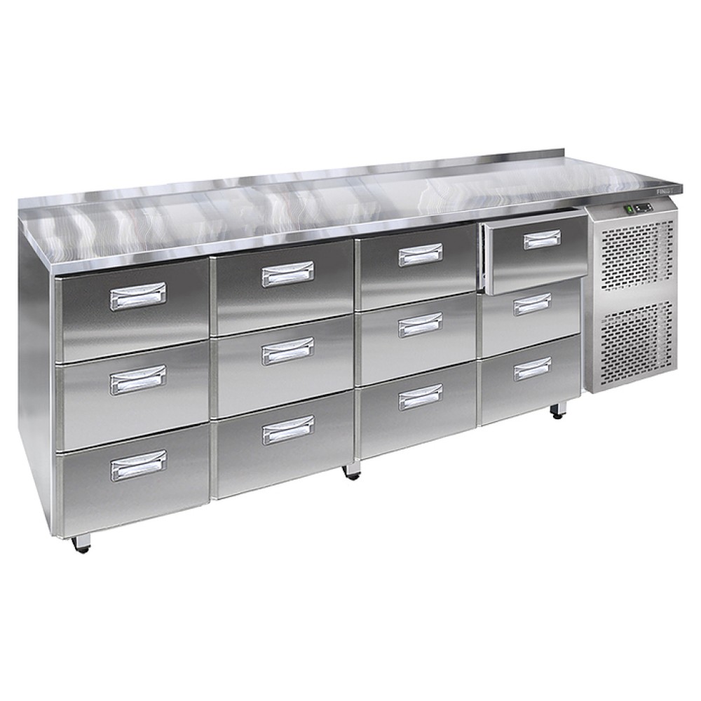 Холодильный стол Finist СХС-700-0/12 предназначен для хранения пищевых продуктов и напитков на предприятиях общественного питания, торговли и пищевых производствах. Модель оснащена 12 выдвижными ящиками с доводчиками, обеспечивающими гарантированное закрытие и поддержание заданной температуры в рабочем объеме стола. Передняя панель моторного отсека имеет большую площадь перфорации, что позволяет обеспечить холодильному агрегату поступление воздуха для охлаждения. Изделие выполнено из высококачественной пищевой нержавеющей стали, которая отличается прочностью и долговечностью, не впитывает загрязнения и легко очищается.