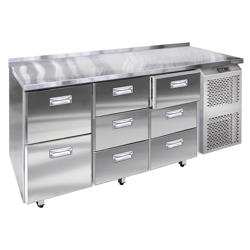 Холодильный стол Finist СХС-700-0/8 предназначен для хранения пищевых продуктов и напитков на предприятиях общественного питания, торговли и пищевых производствах. Модель оснащена 8 выдвижными ящиками с доводчиками, обеспечивающими гарантированное закрытие и поддержание заданной температуры в рабочем объеме стола. Передняя панель моторного отсека имеет большую площадь перфорации, что позволяет обеспечить холодильному агрегату поступление воздуха для охлаждения. Изделие выполнено из высококачественной пищевой нержавеющей стали, которая отличается прочностью и долговечностью, не впитывает загрязнения и легко очищается.
