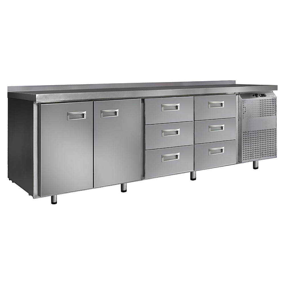 Холодильный стол Finist СХС-700-2/6 предназначен для хранения предварительно охлажденных мясных и рыбных полуфабрикатов, заготовок для салатов, молочной продукции, охлажденных напитков и других пищевых продуктов на предприятиях общественного питания и торговли. Модель оснащена расположенным сбоку агрегатным отсеком, столешницей с задним бортом, 2 холодильными камерами с распашными дверцами, 6 выдвижными ящиками с доводчиками, устойчивыми ножками с подпятниками, кабелем питания с евровилкой и кнопочной панелью управления с цифровым дисплеем. Корпус выполнен из высококачественной нержавеющей стали.