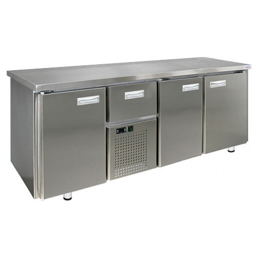 Холодильный стол Finist СХСка-700-3 предназначен для хранения предварительно охлажденных мясных и рыбных полуфабрикатов, заготовок для салатов, молочной продукции, охлажденных напитков и других пищевых продуктов на предприятиях общественного питания и торговли. Модель оснащена расположенным снизу агрегатным отсеком, 3 секциями распашными дверьми, гастрономированным выдвижным ящиком с доводчиком, устойчивыми опорами, кабелем питания и панелью управления с цифровым дисплеем. Корпус выполнен из высококачественной нержавеющей стали.