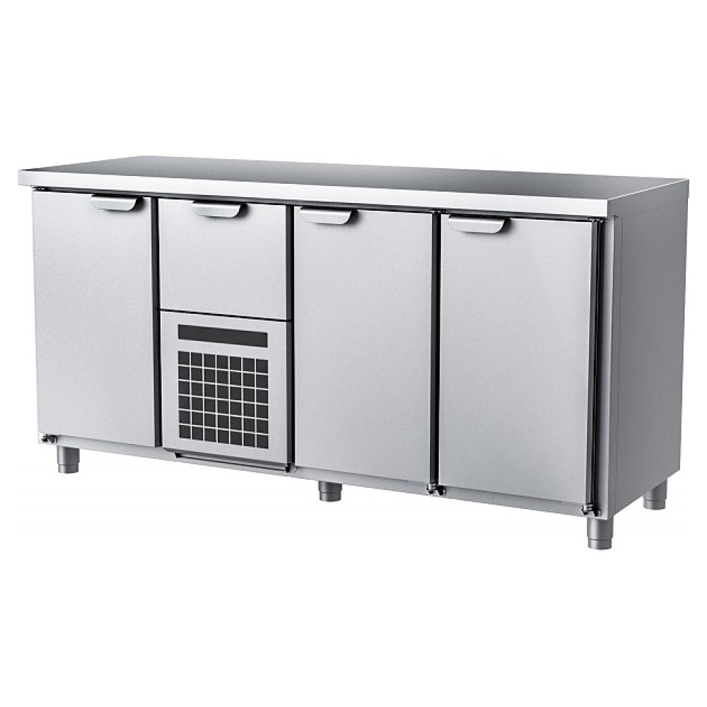 Холодильный стол HappyChef TC BD 1-CBR-1-1 предназначен для хранения предварительно охлажденных пищевых продуктов и напитков, а также обработки ингредиентов в процессе приготовления блюд на предприятиях общественного питания и торговли. Модель оснащена секцией с компрессорным холодильным агрегатом со съемной холодильной кассетой (Россия) с нижним центральным расположением и верхним выдвижным ящиком, 2 секциями справа и 1 секцией слева с глухой распашной дверью в каждой, усиленной столешницей без борта и электронной панелью управления, двери и ящик имеют короткие горизонтальные рукоятки в верхней части. Корпус выполнен из нержавеющей стали марки AISI 430, столешница – из нержавеющей стали марки AISI 304.