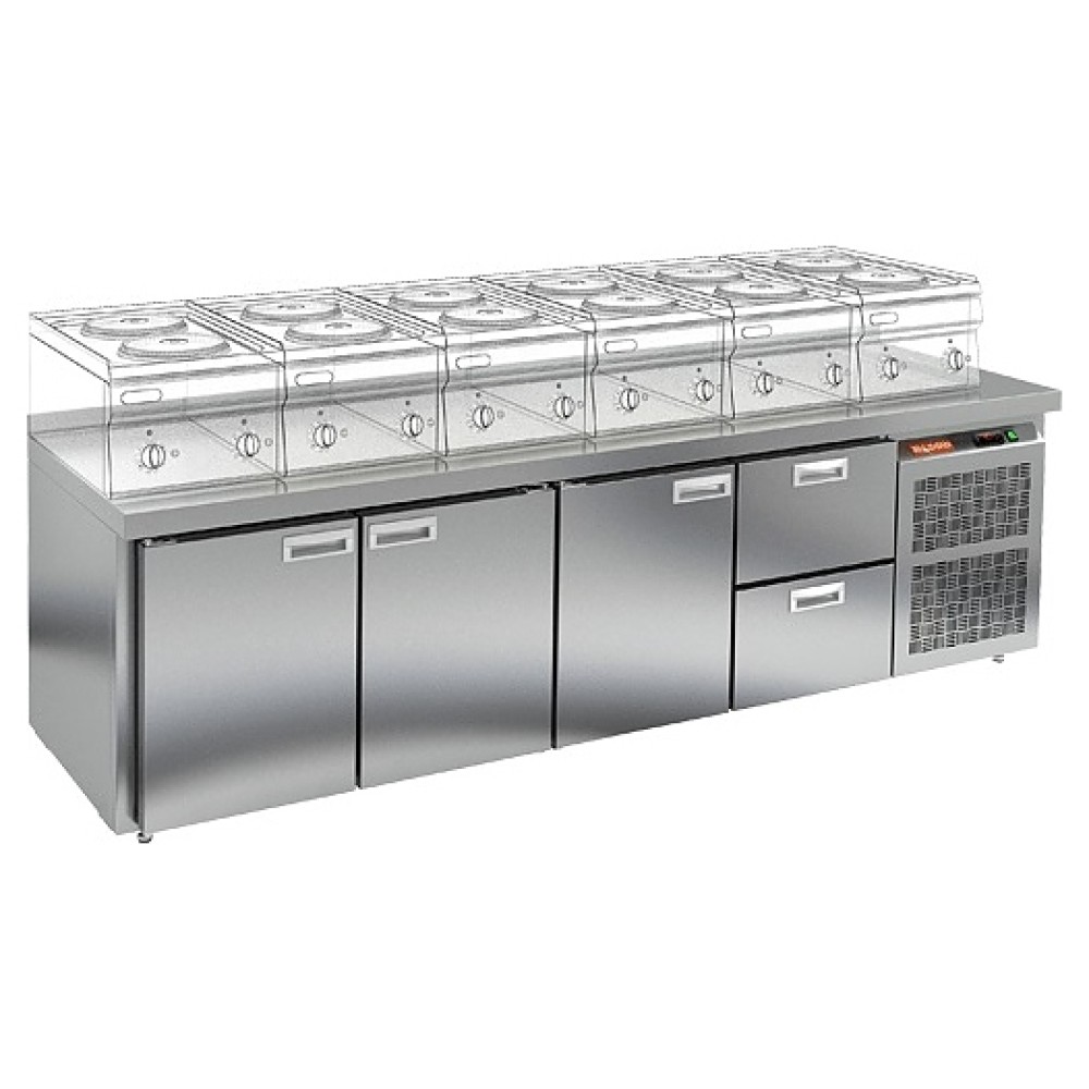 Холодильный стол HICOLD GN 1112 BR2 TN LT предназначен для хранения предварительно охлажденных пищевых продуктов, обработки ингредиентов в процессе приготовления блюд, а также размещения теплового оборудования на предприятиях общественного питания и торговли. Модель оснащена встроенным компрессорным холодильным агрегатом с боковым расположением, электронной панелью управления, столешницей c бортом, холодильной камерой с 4 секциями: 3 с распашной дверью в каждой и 1 с 2 выдвижными ящиками. Корпус и столешница выполнены из нержавеющей стали.