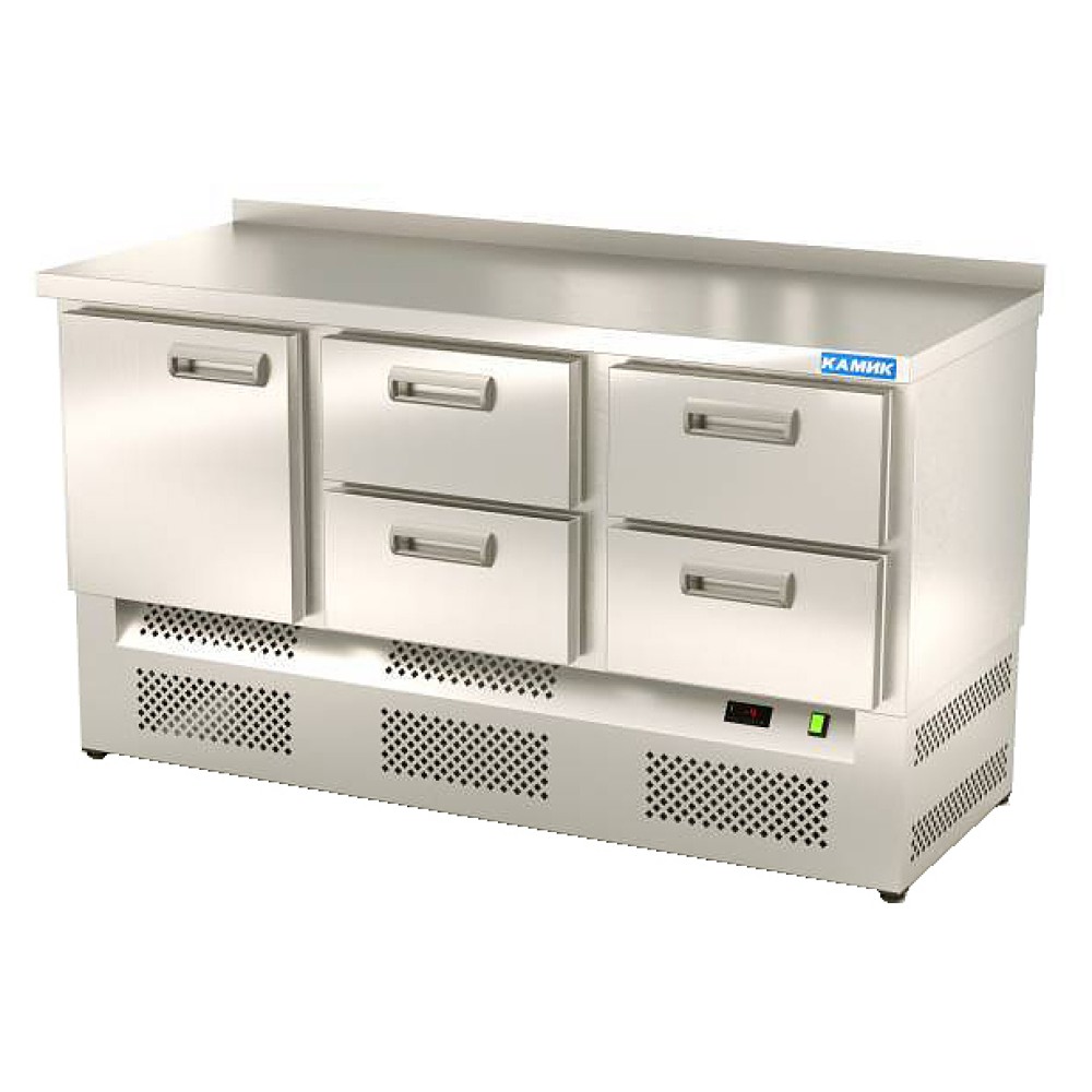 Холодильный стол КАМИК СОБН-14158 используется на предприятиях общественного питания и торговли для охлаждения и хранения продуктов, напитков и готовых блюд. Конструкция разделена на секции, каждая секция с дверью оснащена полкой сетчатой и парой направляющих. Корпус выполнен из нержавеющей стали AISI 430 толщиной 1 мм, столешница - из нержавеющей стали AISI 304 толщиной 1,5 мм.